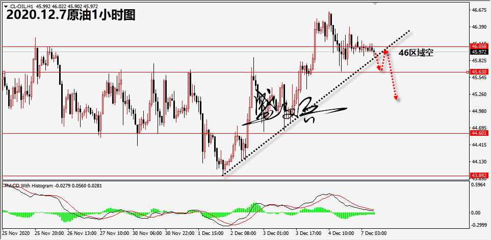 原油近期利好原油的预期基本上出尽,原油面临调整下跌的可能较大。从形态来看,原油从34--46.6上涨的五浪结构结束。4小时图突破高点后并未持续的上扬,而且MACD在死叉背离向下,预示价格有回落的空间。从当前位置来安,价格在上涨线附近横盘,跌破的概率较大,激进者现价46区域直接参与空头,稳健者可以等待价格跌破趋势线再反抽该区域线抽参与空头。