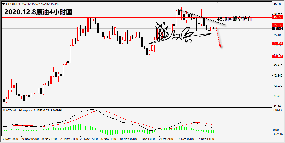 原油正如笔者的预期,欧盘价格冲高至45.9位置后回落,笔者在欧盘明确给在45.6区域参与空头,只要根据笔者策略在该区域参与空头者,目前已经开始获利。