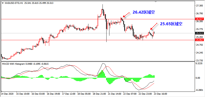 白银今日同样符合笔者的预期,价格在25.65区域的空头成功的获利,但是价格并未延续跌势跌破25区域,在25.2一线获得支持回落,空头成功的获利。周二笔者给出26.42区域的空头同样成功获利,目前已经没有合适的位置参与空头。