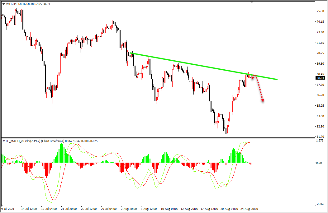 原油现在承压于4小时压力位,今天有回调需求,所以今天关注68.50压力位。