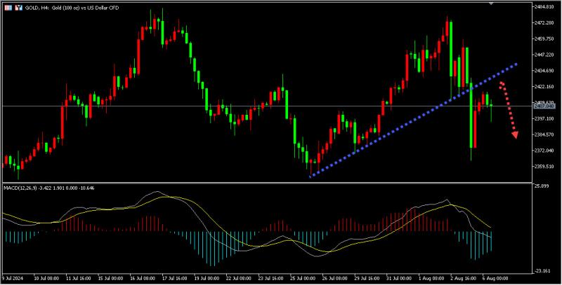 周一金价受累于经济担忧加剧导致全球更广泛市场遭抛售,黄金价格下跌超过1%,盘中最低曾触及2364.21美元/盎司。今日黄金关注上方4小时上升趋势线突破以后形成的压力位2430区域,承压后做空黄金。