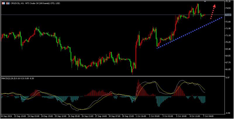 油价周一(10月7日)早盘回吐上周部分涨幅,上周五创下一年多来最大单周涨幅,因中东地区战争威胁日益加剧;美国非农就业报告表现强劲,美股延续涨势,也改善经济前景预期和原油需求预期。今日原油关注下方1小时上升趋势线支撑区域,调整企稳后做多原油。同时本周将是全球经济数据密集发布的一周。投资者将关注美国的CPI和PPI数据,以及新西兰联储的利率决定和美联储官员的讲话。这些数据将为市场提供更清晰的经济前景指引,影响油价的短期走势。此外,亚洲大国市场在黄金周假期结束后将重新开市,投资者期待政府出台进一步的刺激措施。