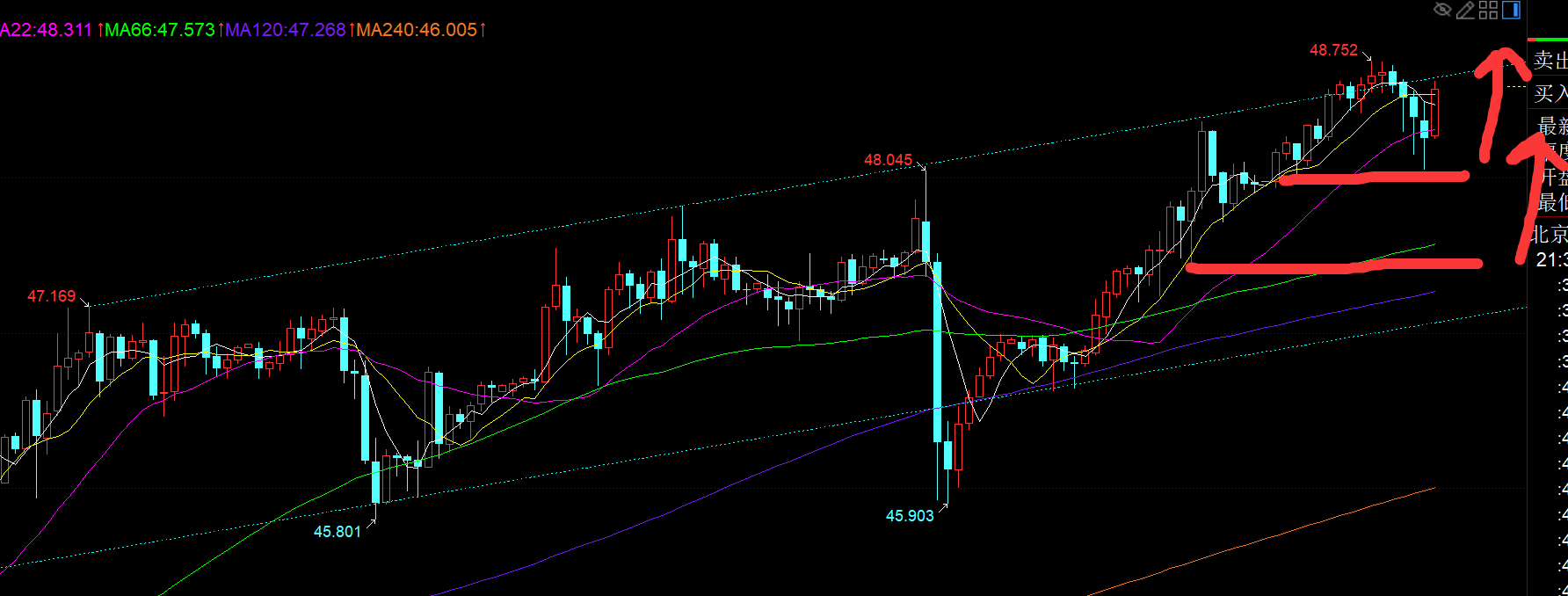 第二,白银方面:上周五早间两次探底拉升长下影K,都是回踩确认图中黄色通道下轨支撑稳住,午后突破小时线中轨重新站上,则认为隔夜的一波下跌结束了,回归强势拉升;因此,47.15直接跟随看涨,美盘前就已抵达47.7目标,然后美盘又延续上拉靠近通道上轨48.36一线,一个大V拉升非常猛,这也表明白银短期依旧处于强势阶段;