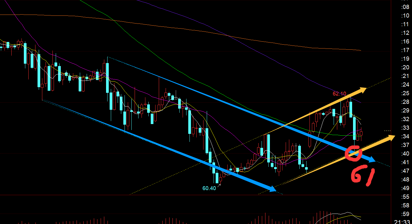 原油方面:早间跳空高开拉升一波,但欧盘并未延续拉升,所以今晚还需继续观察;从图中通道分布看,61一线属于两通道共振支撑点,看今夜能否一直稳住此位置之上运行,再考虑去看一波超跌反弹; 若守不住61,那么就要回补缺口,届时60之上稳定再去等企稳的形态了;