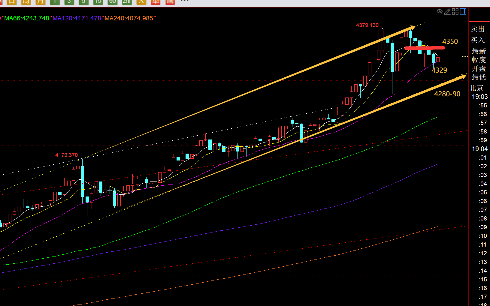 第三,黄金小时线级别:从上图看,当前处于黄色上升通道内,上轨两次承压4380一线,存在一定双顶,但必须跌破4280-90早间打出的低点,才能形成M头有效压制;不过,欧盘是处于连阴单阳震荡下滑,阴线数量过多,暗示下跌动能在积累; 关键支撑是中轨,此时上移4329,一旦大阴或连阴有效破位失守,那么基本会向下继续砸盘下行;若破日内低点,就很快可以指向4220一线前期通道回踩点,也刚好是日线5均线位置,然后观察它是否企稳,日线修复到位了,那么后市才可以大胆继续逢低顺势去看涨走高; 若4220守不住,那么往下是4162;阻力很明确,节点承压位置就是4350,欧盘横盘的位置,10均线压制点,若它又突破上去了,那么有可能是反复洗盘去摸日内高点,这点也要做好预备打算;总之,今晚小心一波砸盘修正;