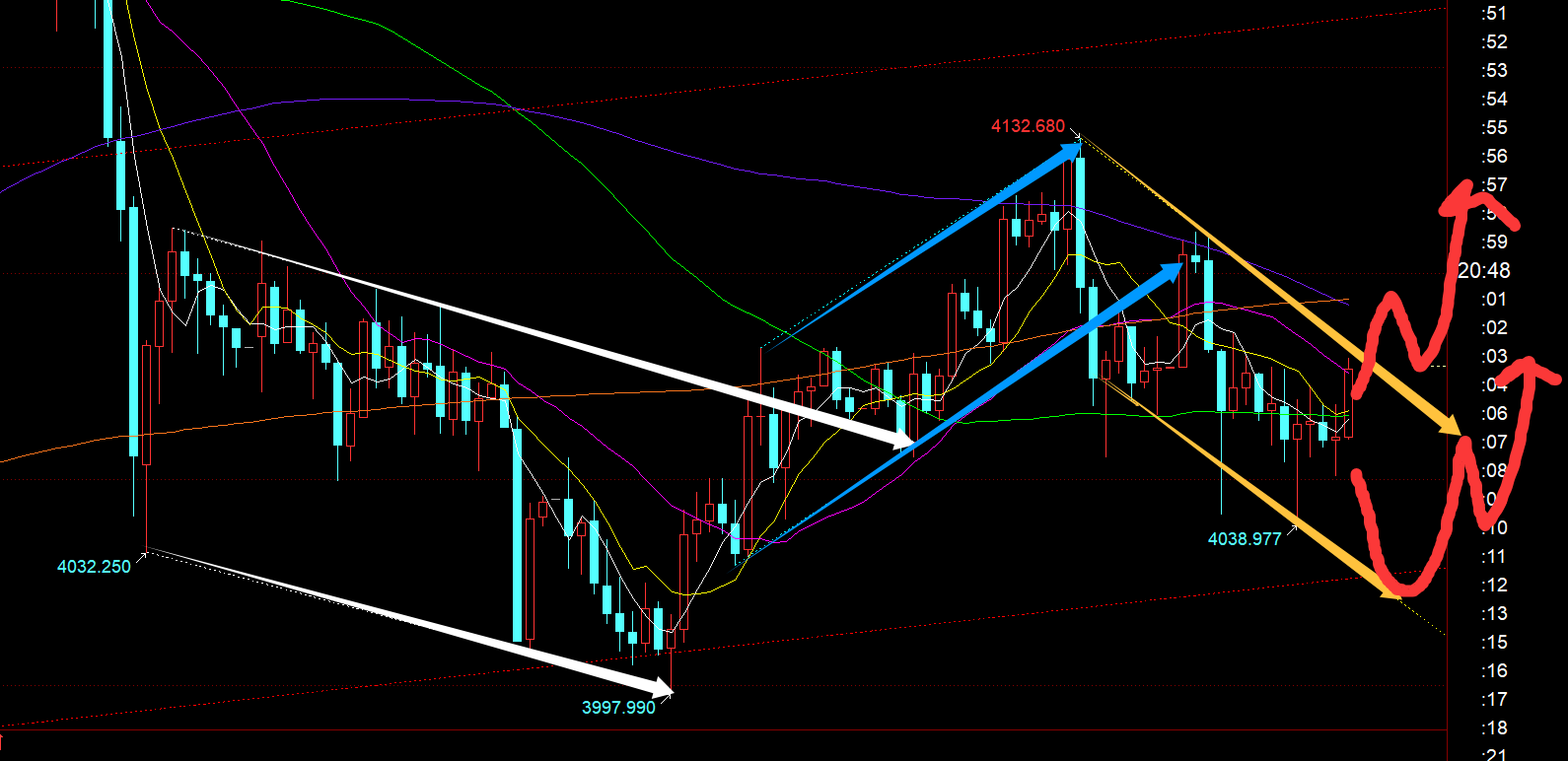 第三,黄金小时线级别:早间还是循环下跌,4101-4023的618分割支撑4053,或者收盘前4055支撑都未守住,向下直接试探了4040,它是上图红色通道下轨支撑,上周五也是围绕4030此通道下轨反复插针后企稳;午后及欧盘连阳V走高,再次试探了4077早间高点,双顶承压后回落至中轨进行试探确认;目前来看,中轨4066确认试探存在支撑,再次拉升反弹关注4077,一旦突破则留意白色趋势阻力线对应承压点,大概4086-90,突破它才能去试探4100-4110密集承压处;而作为震荡往复走法,提及的每一个目标阻力都或存在短线的承压回落,两步一回头,不是很干脆,需耐心等待;总体上,保持震荡看涨反弹为主;