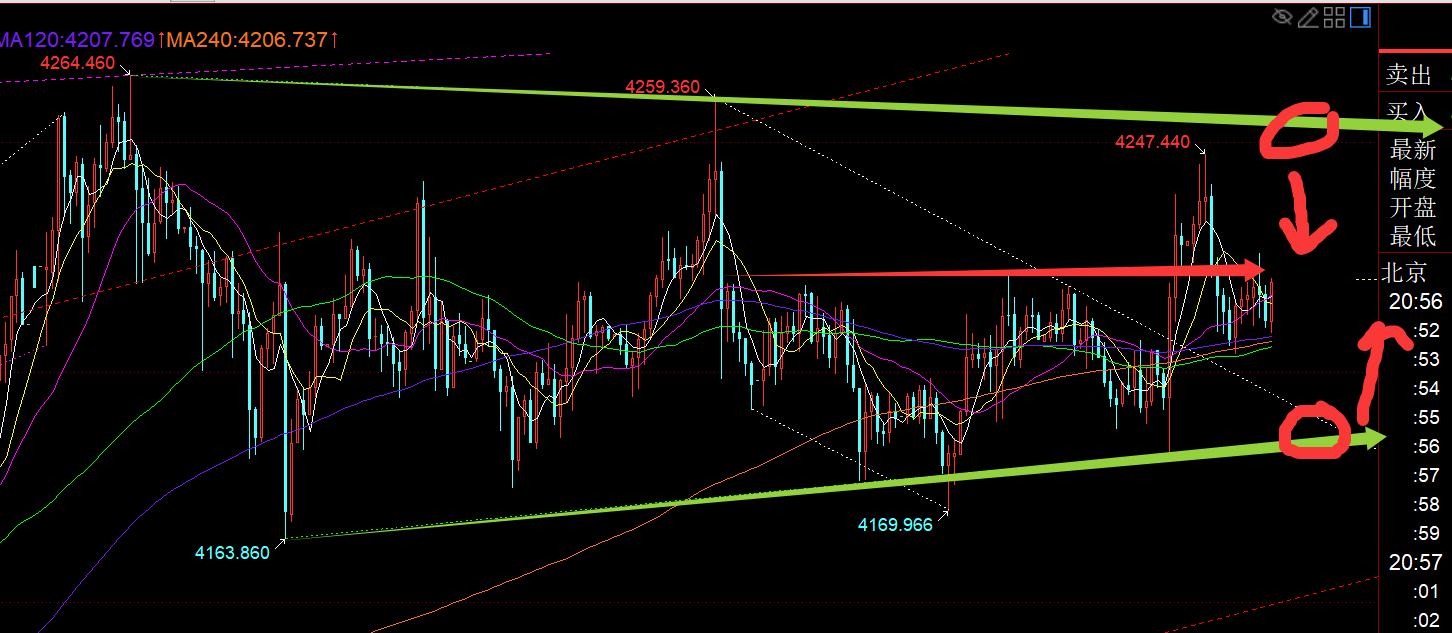 第二,黄金小时线级别:早间分析得出,以4264-4259作为通道上轨,4164-4182作为通道下轨,处于一个收敛三角内整理运行,而一早对应的上轨承压点是4253-54,早间先拉升只要承压此处不上破,则会压制冲高回落走收敛震荡,最终是符合思路,最低跌至4204;而结合隔夜涨幅回踩618分割支撑来看,4207附近是可以尝试做一次企稳反弹,最终拉升至4225下逢高收米;对于今晚来看,亚盘冲高回落一波,而欧盘整体运行格局并不强,只是承压50分割阻力4225就开始有所压制,此时围绕中轨来回串,预计也在等美盘的数据指引;若向上突破4225,则留意4230、4253下承压仍会冲高回落;若有效跌破中轨下行破底,那么下方留意4194、4185企稳反弹,继续震荡来对待;
