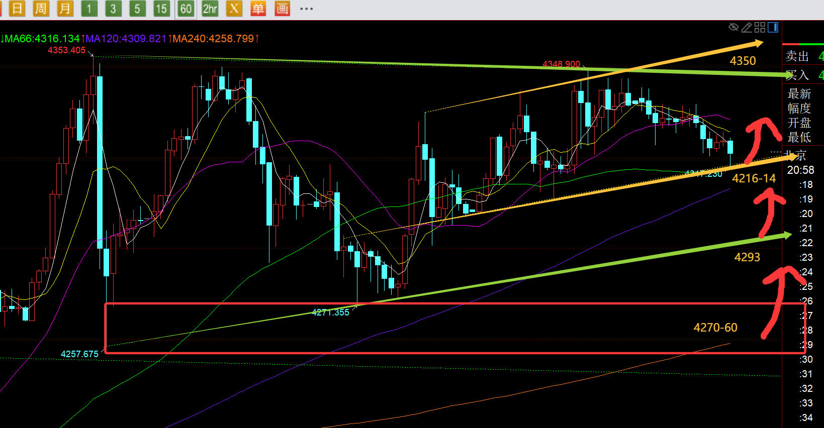 第二,黄金小时线级别:今日白盘整体波动不大,早间预判的阻力和支撑都未试探;隔夜多次承压4350下最终回落,今日早间横盘压制4337,此位置也算是是日内当时的618分割阻力点,价格当时一直围绕中轨窄幅运行,就没太大的操作价值,欧盘向下跌了一波,此时刚好试探了图中黄色通道下轨支撑,也是66日均线处4316,它也是逼近日线5均线附近,但由于21点半公布大数据CPI,一般公布之前最好冷静观望,谁都无法预测数据的结果,此时贸然进去,就是赌数据,凭运气;从通道分布看,今晚就留意两个关键位置,一个是4316-14,另一个是绿色收敛三角下轨支撑4293,较为极限的就是4270-60,前低以及年均线,这也日线10均线共振;所以这和数据公布是分不开的,若利多金价,基本就是4316-14的上方找位置去看涨;若利空,就是等下滑低位4270-60上企稳再去看涨,这个位置或许相对低位了,只要敢稍微深蹲,就会有很多买盘涌入,把握住一个较低位看涨,拿住底仓,明年就有很大的趋势利润空间;