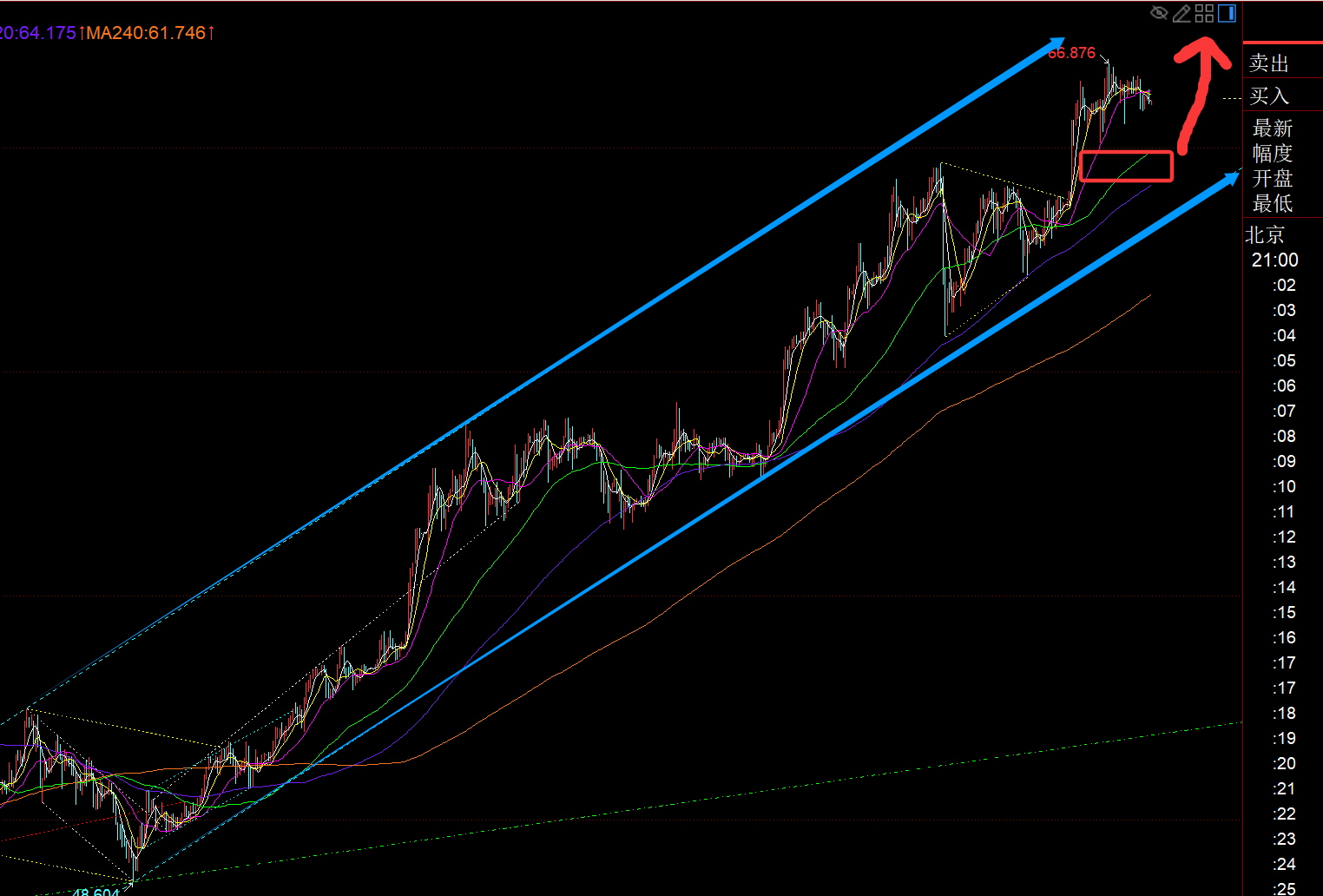 白银方面:昨日收报大阳,今日仍是回踩继续强势看涨单边为主,继续逼空行情; 5均线支撑64.4一线,小时线66日支撑64.9-65一线,顶底支撑64.6,短期这几个位置都有支撑;只要维持图中蓝色上行通道内发展,仍就保持良好的上涨势头;