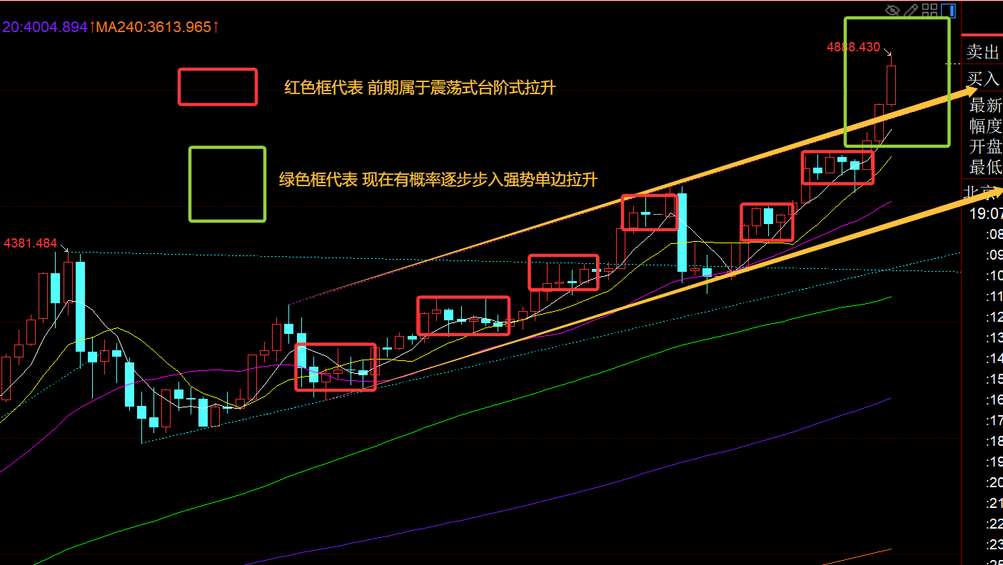 第一,黄金日线级别:昨日继续收报大阳,且有效突破去年11月份以来的上行通道上轨,今日当前又是大阳出现,这连续三天的大阳拉升,就基本打破了之前震荡阶梯式上涨的循环形态(大阳+横盘+大阳+横盘),一定程度上开启了强势单边逼空上涨迹象,因此接下来只能继续顺势跟随北上,不去猜顶,随着价格逐步抬高,尽管随时可能会出现获利盘打压,但北上之路仍要坚持下去;作为强势单边走法,若某一日出现收阴,只要处于短期均线之上的,基本都是单阴修正,可以更好地找到低位参考位置跟随北上;因此,从上图可以黄色通道看,只要处于上轨的上方运行,就会继续维持强势单边格局,按这样发展下去,离5000关口也就不远;去年指出下一个长线目标5415,预计今年中旬之前都可以实现到位,拿好手中趋势底仓继续看北,尤其是积存金,实物,基金等,到1220-1225元/克再考虑减持,这个位置也可能只是相对保守的,未来的高度无法估量;