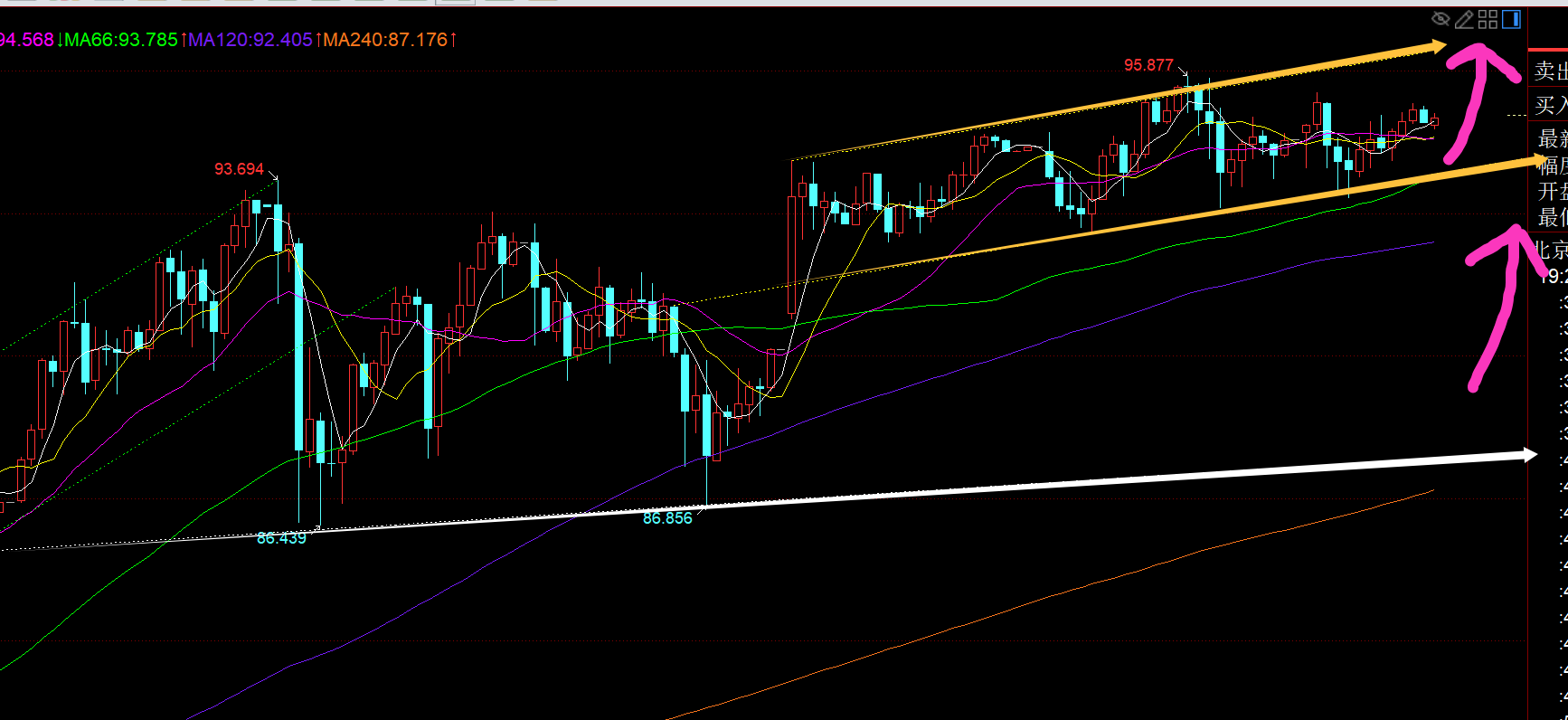 白银方面:日线级别,当前仍是维持5日之上运行,前期白银涨幅大于黄金,这两日它开始高位横盘,而黄金强势上攻,金银比开始反弹修复,这也是好事;因此修复完毕后,金银比依然会下挫,那么白银横盘结束,就依然会单边强势上攻,再冲一波基本往99-100去靠拢;那么从图中看,今天的震荡范围还是围绕黄色通道,支撑93.5-93.7继续北上,阻力96-97;