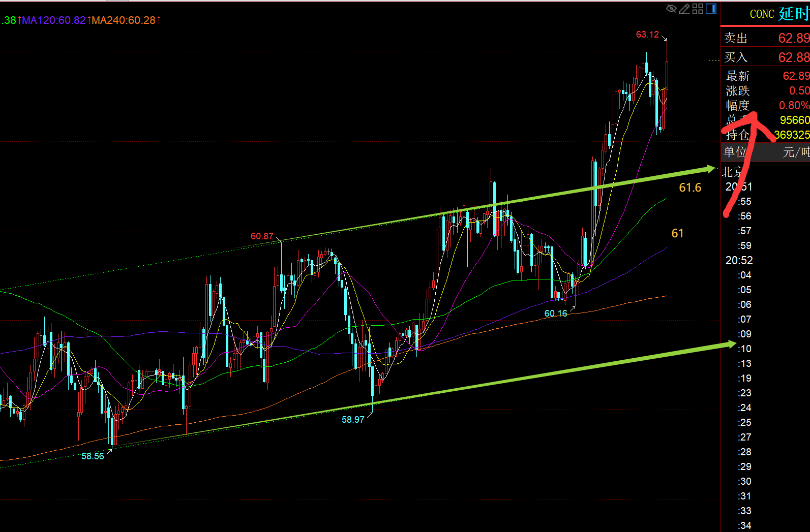 第三,原油方面:绿色通道已有所上破,回踩确认的支撑是61.6一线,而59.97-60.16趋势线衍生支撑点大概会上移61附近,所以这两处企稳可以继续看反弹,阻力63日线年均线,有效站稳它则可以进一步走强;