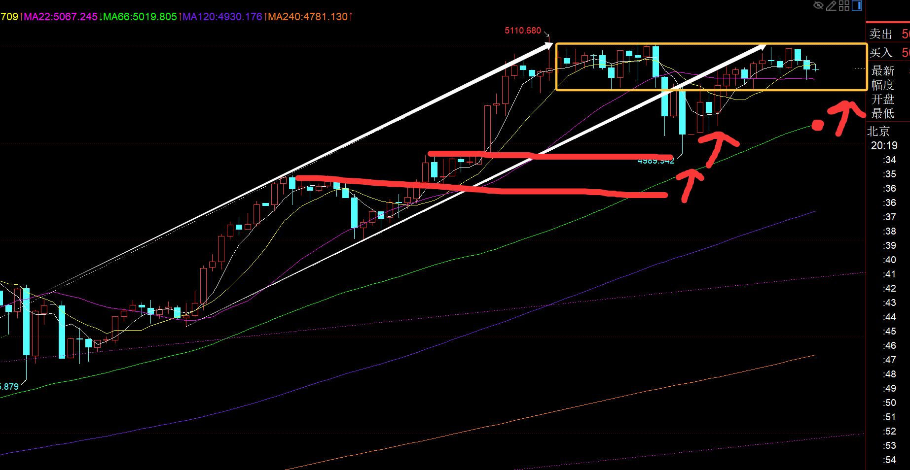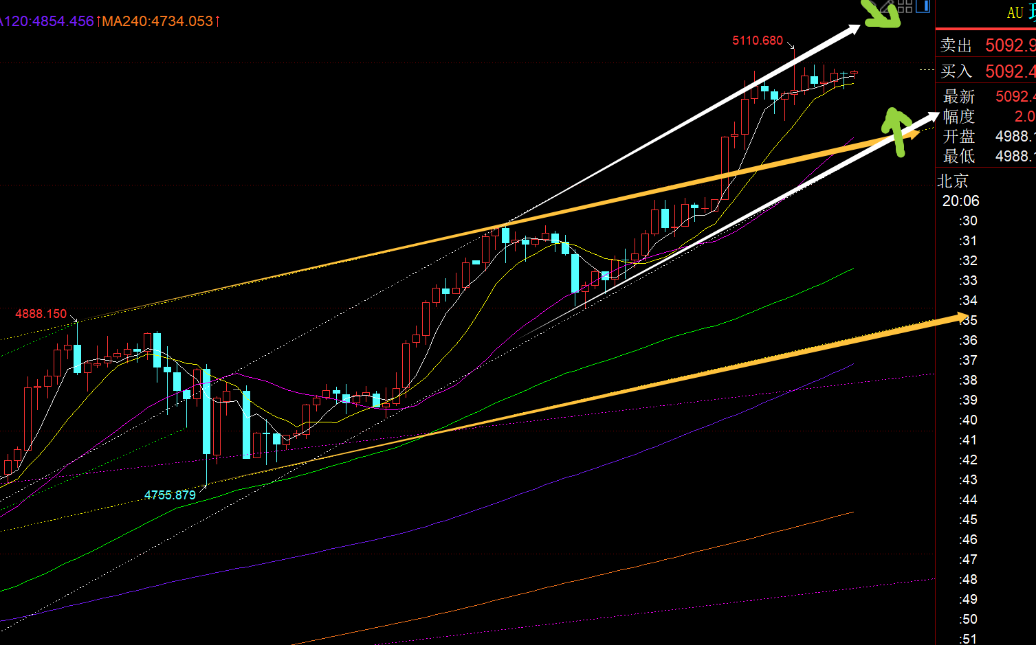 第一,黄金日线级别:昨日收报下影线长于上影线的纺锤体阴K,低点暂时企稳于4274-5598的382分割支撑5093上,今日目前出现大阴K,失守5均线,直接刺破了10均线5020,低点打到了50分割支撑4936上;那么作为一波强势单边拉升,修正的最大程度一般是短期均线,而10均线比较关键,因为守住它,则还能继续维持强势逼空状态,很快过几日又会爬升高位;若守不住10均线,那么就可能试探中轨,也是作为强势行情,最后的底牌;并不是说,失守了中轨,短趋势就改变了;而是失守了中轨,想要再回归强势单边格局,就要花更多的时间来整理酝酿,类似3500、4381那两次的整理;所以,今晚我们暂时盯住10均线的得失情况,以及50分割支撑4936的得失,能收盘稳住,且处于10日附近不远,那么下周初还是有很大希望尽快恢复强势拉升格局;