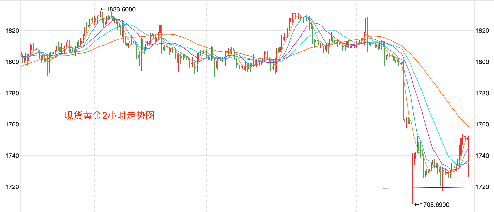 金价从1445美元/盎司的前期低点一路展开上行,创出之前2075的新高后,先回落后持续震荡下跌达到11个多月。当前整体价格在MA200上下运行,MACD指标弱势震荡,形成继续下跌的走势。近期短线走势将以1650-1700美元之间的关键支持触底反弹;日内短线看上冲1760附近有调整趋势。