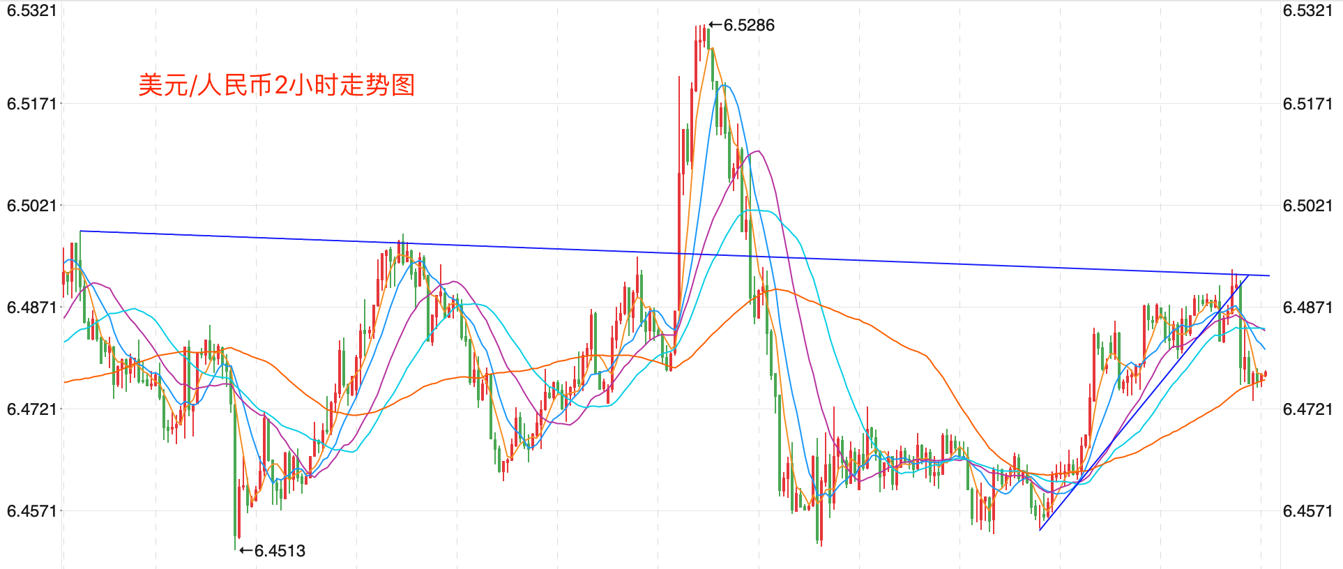 离岸价前期自2020年5月高位7.1964开启下跌走势,盘中跌破MA200均线的关键支持而下行走低;2021年5月触及6.3477点低位后开始震荡走高。当前行情日内有下跌测试6.47支持的趋势。