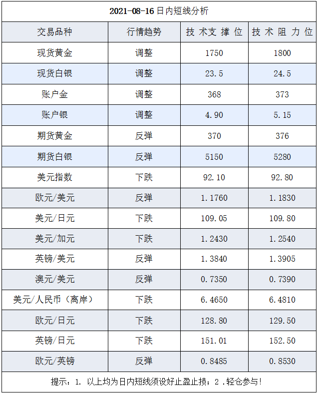金砖汇通观点认为,利多和利空因素同时存在,但是当前的走势看市场明显偏空美元的表现。在德尔塔病毒的影响下,市场对美联储是否提前收进宽松的举棋不定,都在支持黄金白银的反弹走势;因此,当前金银操作层面以回落后继续分批逢低买入为主。