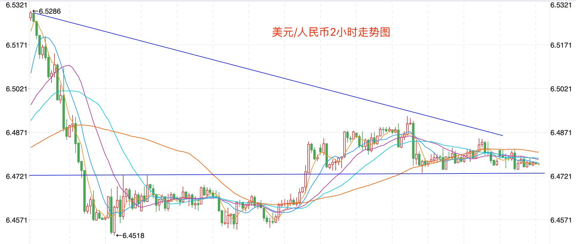 离岸价前期自2020年5月高位7.1964开启下跌走势,盘中跌破MA200均线的关键支持而下行走低;2021年5月触及6.3477点低位后开始震荡走高。当前行情日内有下跌测试6.47支持的趋势。