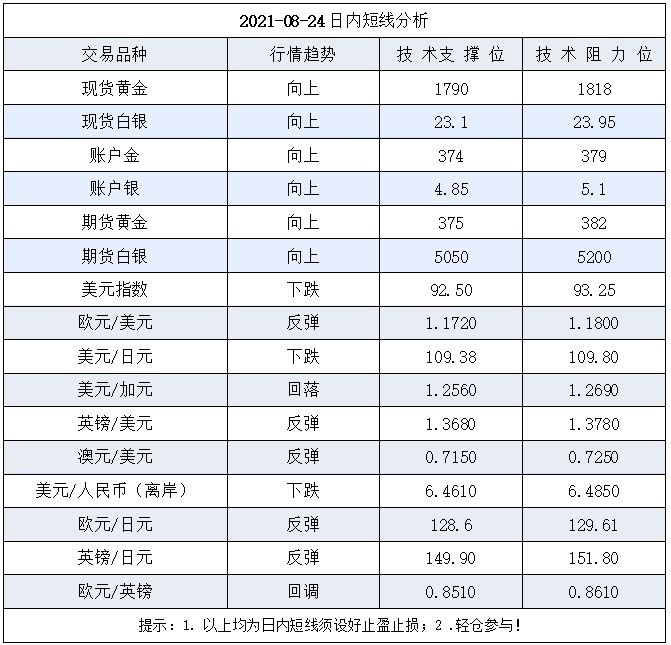 欧元区 欧元区昨天公布的经济数据整体表现还不错,法国8月Markit制造业PMI初值为57.3,高于市场预期的57.2;但是德国公布的8月Markit制造业PMI初值为62.7,低于市场预期的65.0;欧元区8月Markit制造业PMI初值为61.5,低于市场预期的62;其次,欧洲在面临阿富汗可能带来的持续动荡和难民压力越来越大,喀布尔无政府局势延续一周的时间后,局势开始出现了恶化的趋势。第三,欧洲央将于周四公布7月会议纪要,该行管委维勒罗伊预计会重申,讨论削减紧急抗疫购债计划(PEPP)规模还为时过早,这会遏制欧元修正反弹的潜在上行空间。整体来看欧元的反弹是美元下跌的助长结果。
