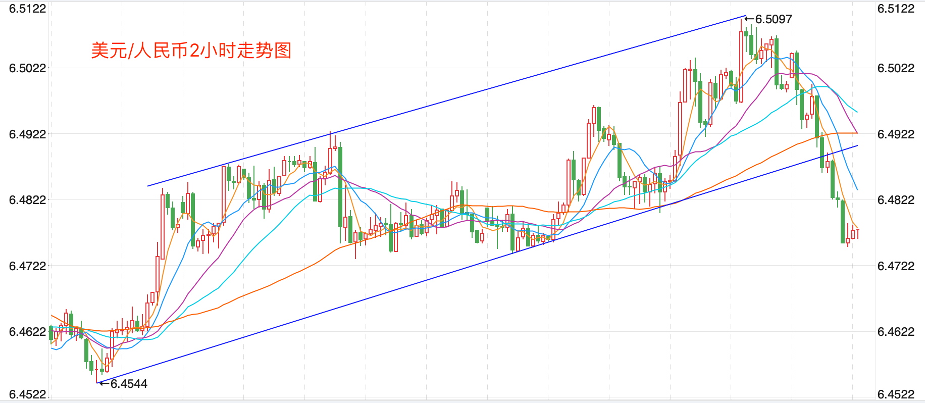 离岸价前期自2020年5月高位7.1964开启下跌走势,盘中跌破MA200均线的关键支持而下行走低;2021年5月触及6.3477点低位后开始震荡走高。当前行情日内有向下震荡的趋势。