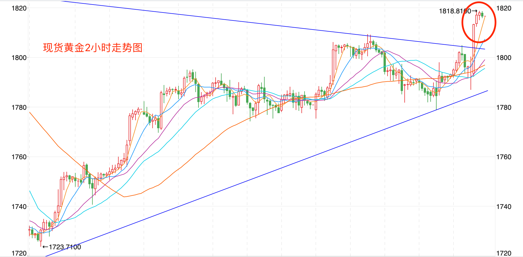 金价从1445美元/盎司的前期低点一路展开上行,创出之前2075的新高后,先回落后持续震荡下跌达到11个多月。当前整体价格在MA200上下运行,MACD指标弱势震荡,形成继续下跌的走势。近期短线1800美元是支持,日内短线有继续向上的趋势,可以逢低看多。