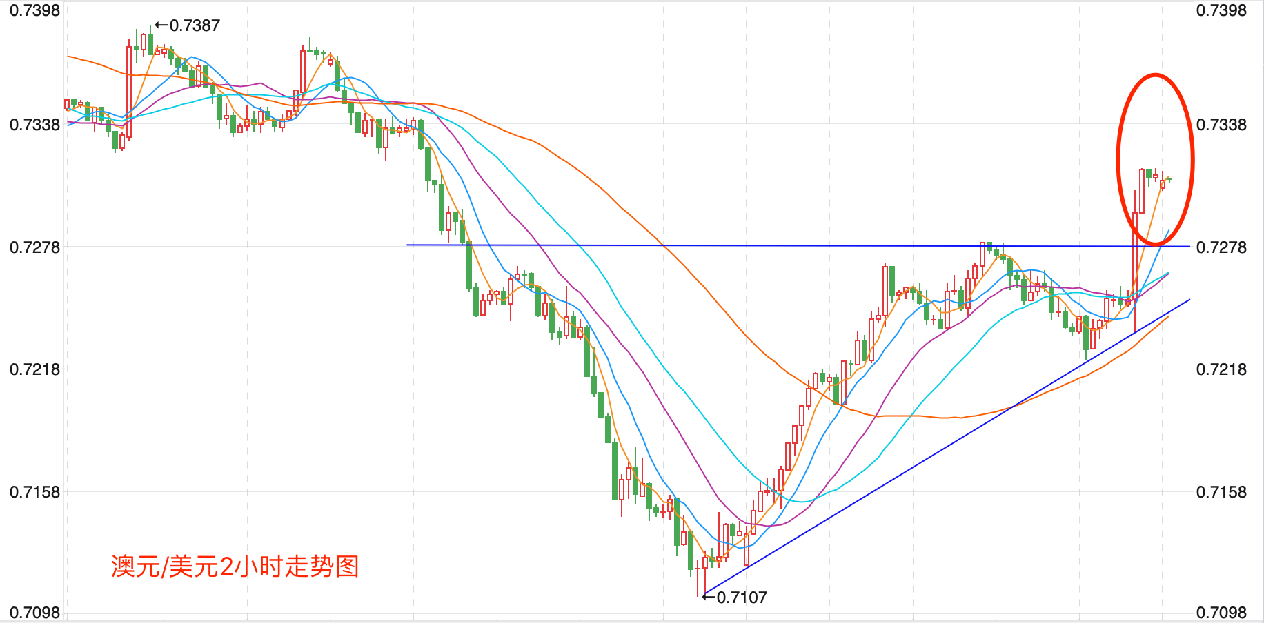 前期自2020年3月底企稳0.56618低点开启上涨走势;盘中突破了MA200均线的关键阻力而上行走高;2021年2月触及0.80072点高位后开始震荡走低。当前行情触底考验0.7280的支持走势后震荡走高的趋势,可以逢低看多。