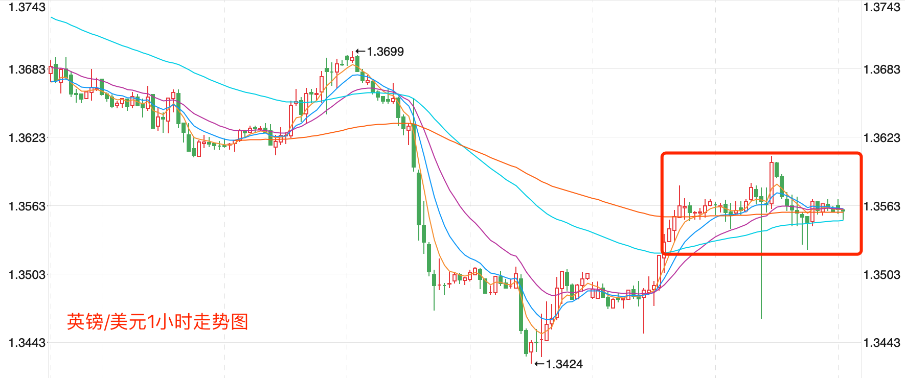 前期自2020年3月底企稳1.14078低点开启上涨走势,盘中突破了MA200均线的关键阻力而上行走高;2021年6月触及1.42493点高位后开始震荡走低,目前中期走势继续震荡向上走势。当前日内行情有调整的趋势。