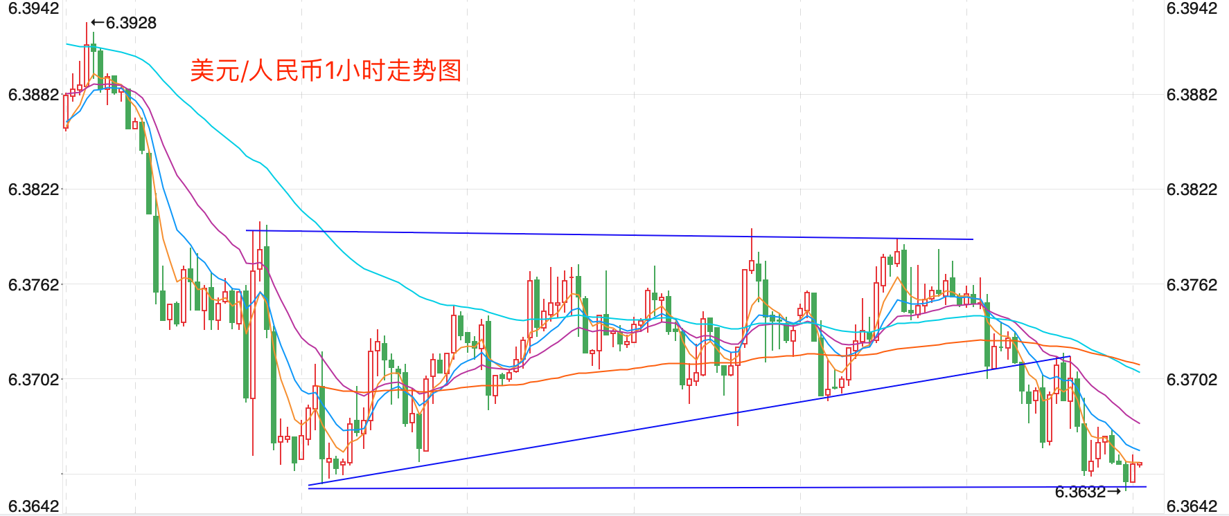 离岸价前期自2020年5月高位7.1964开启下跌走势,盘中跌破MA200均线的关键支持而下行走低;2021年5月触及6.3477点低位后开始震荡走高。当前行情日内有继续小幅探底的趋势。