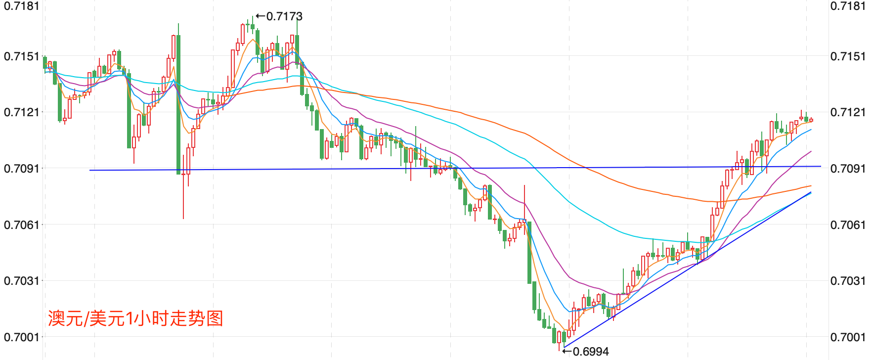 前期自2020年3月底企稳0.5673低点开启上涨走势;盘中突破了MA200均线的关键阻力而上行走高;2021年2月触及0.80072点高位后开始震荡走低,8月底企稳在0.7114点展开反弹走势再度终结,目前重回8月低点调整走势。当前日内行情有继续向上反弹的趋势。