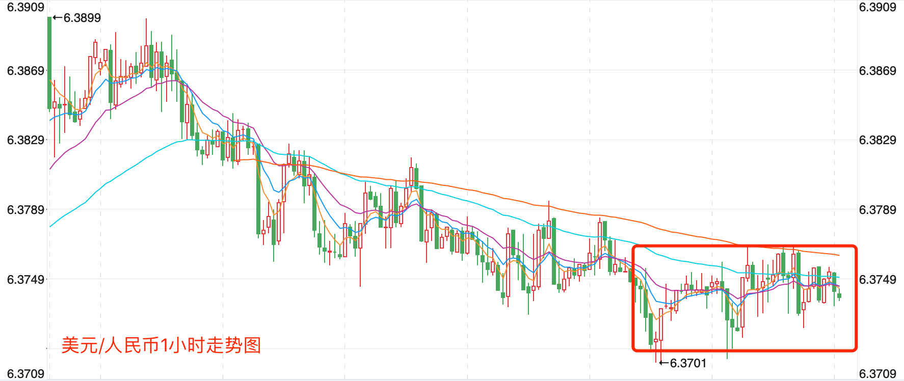 离岸价前期自2020年5月高位7.1964开启下跌走势,盘中跌破MA200均线的关键支持而下行走低;2021年5月触及6.3477点低位后开始震荡走高。当前行情日内有横盘调整的趋势。