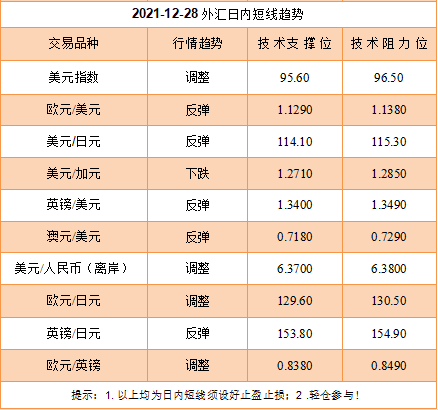 美元对美元指数走势构成影响的因素有以下几个方面,首先,美国公布的12月达拉斯联邦制造业活动指数为8.1%,低于市场预期的13%和前值11.8%得表现;数据的公布利多非美货币和贵金属的表现,对于美元构成不利。其次,美国总统拜登周一(当地时间12月27日)发布行政命令,授权联邦紧急事务管理局(FEMA)为增加新冠肺炎检测工具提供新冠响应援助,并指示美国卫生与公众服务部(HHS)在联邦政府可以提供报销资金的基础上,与州和地方政府合作增加新冠肺炎检测站点。第三,美国市场年末波动加剧,汇市的波动美元冲高回落,美股的波动也加剧,资本市场进入“圣诞老人行情”的周期,从今年最后几个交易日到元旦开始期间,市场表现略微强势为主。综合以上基本面看,金砖汇通判断继续保持美元处在顶部通道的支持位上调整的判断,等待破位的方向跟进操作。