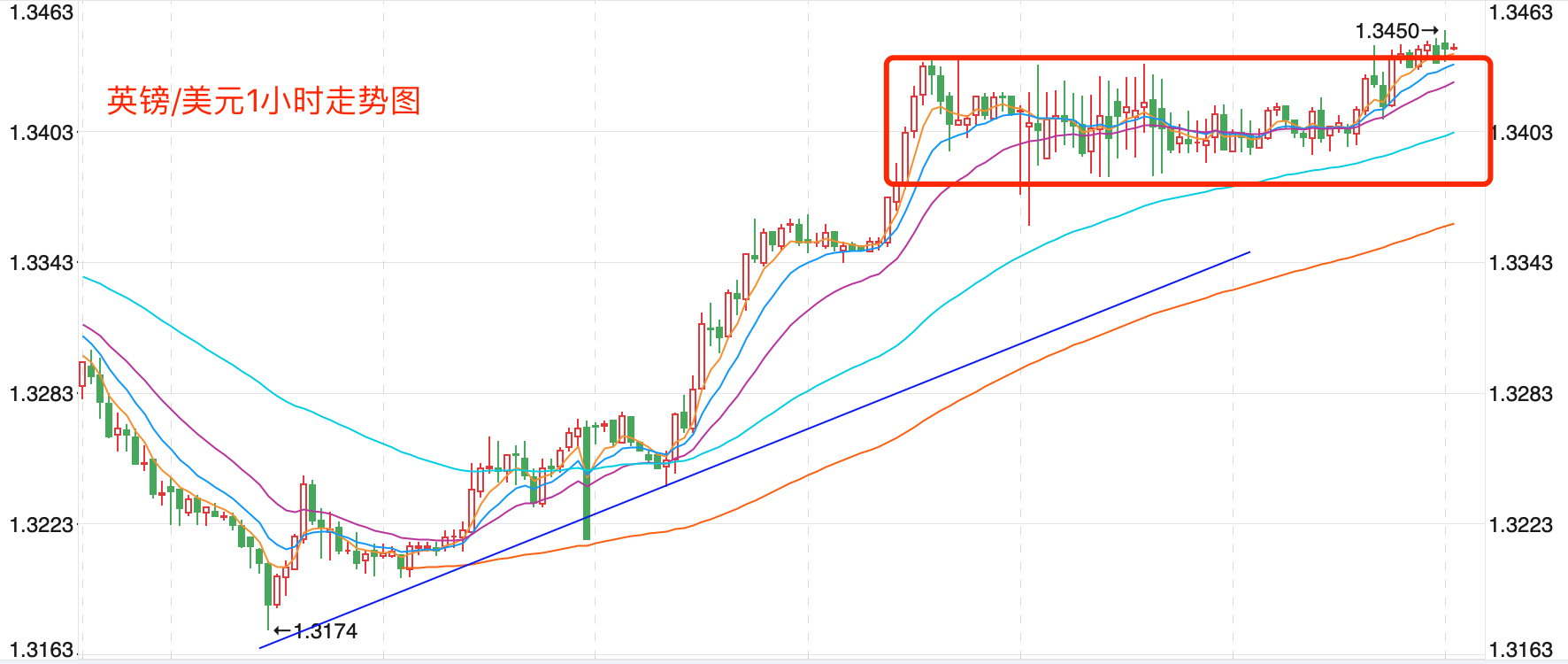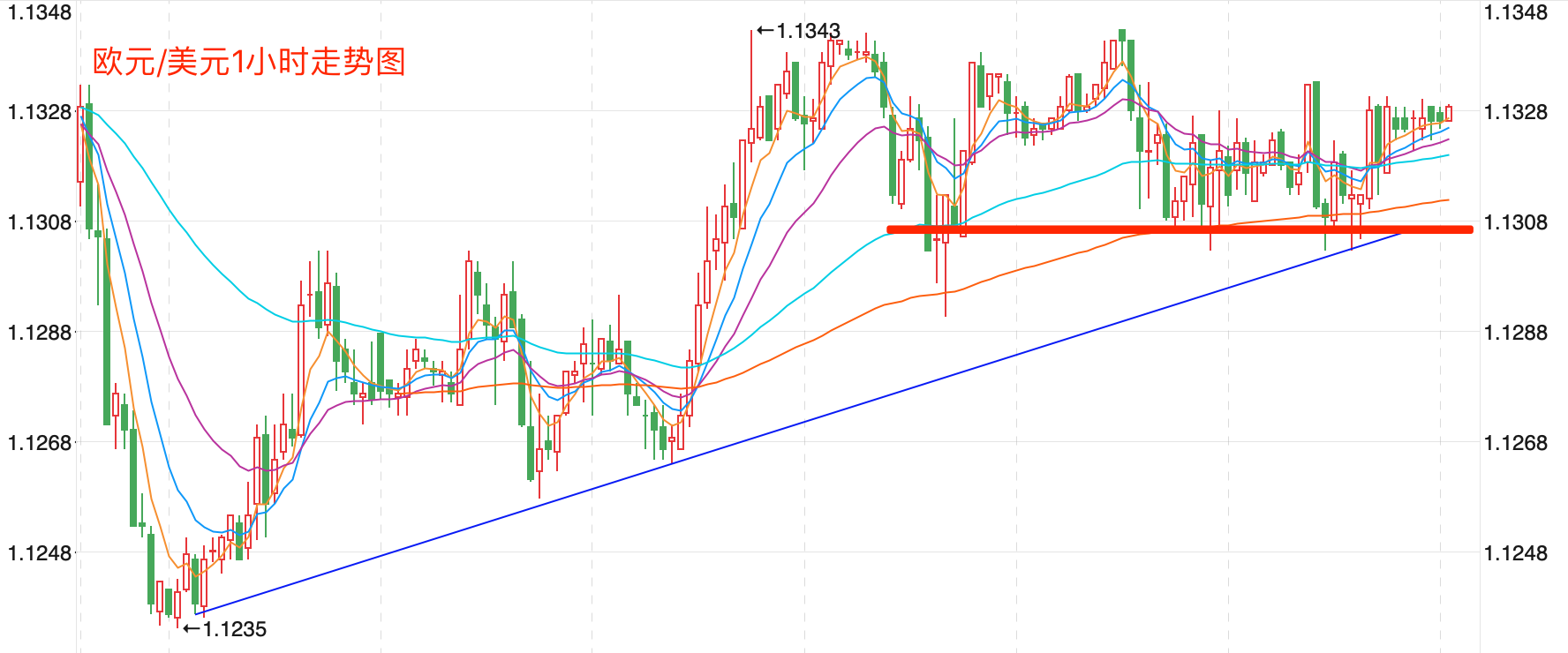 前期自2020年3月底企稳1.0635低点开启上涨走势;2021年1月触及1.23495点的高位后持续震荡下行。2021年11月跌破60周MA均线支持,中长期多空分水岭的支持跌破,行情处在回落调整的下行走势中。当前日内短线行情继续向上反弹的趋势。