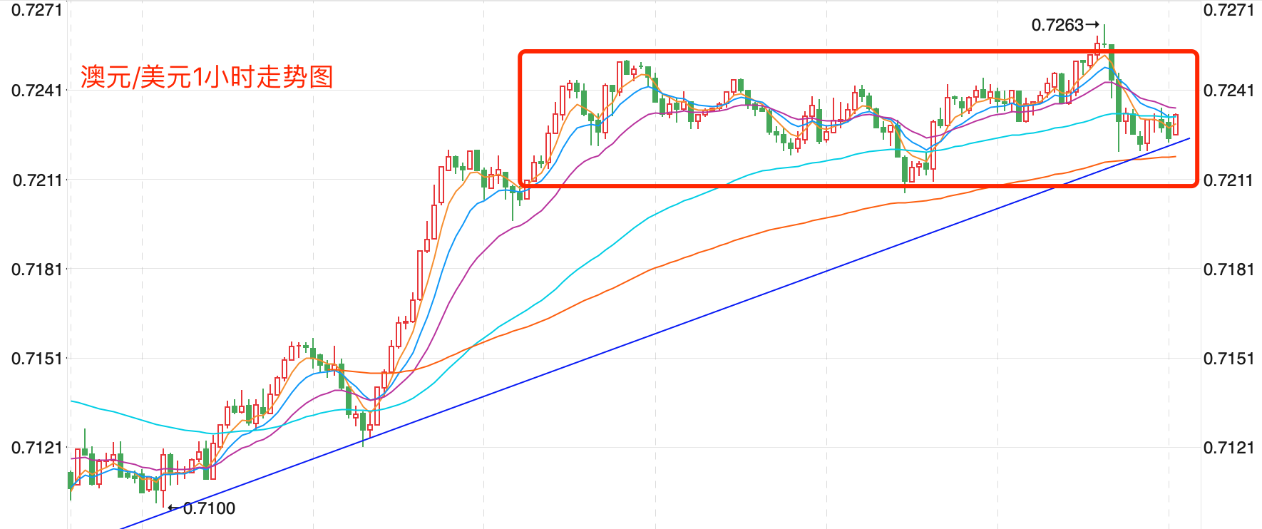 前期自2020年3月底企稳0.5673低点开启上涨走势;盘中突破了MA200均线的关键阻力而上行走高;2021年2月触及0.80072点高位后开始震荡走低,8月底企稳在0.7114点展开反弹走势再度终结,目前重回8月低点调整走势。当前日内行情有向上调整的趋势。