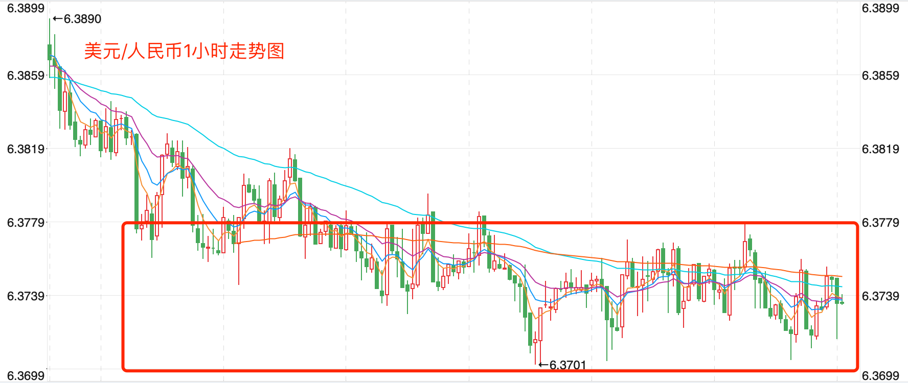 离岸价前期自2020年5月高位7.1964开启下跌走势,盘中跌破MA200均线的关键支持而下行走低;2021年5月触及6.3477点低位后开始震荡走高。当前行情日内有横盘调整的趋势。