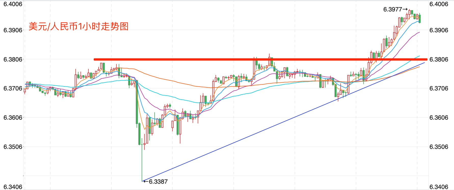 离岸价前期自2020年5月高位7.1964开启下跌走势,盘中跌破MA200均线的关键支持而下行走低;2021年5月触及6.3477点低位后开始震荡走高。当前行情日内有反弹向上的趋势。