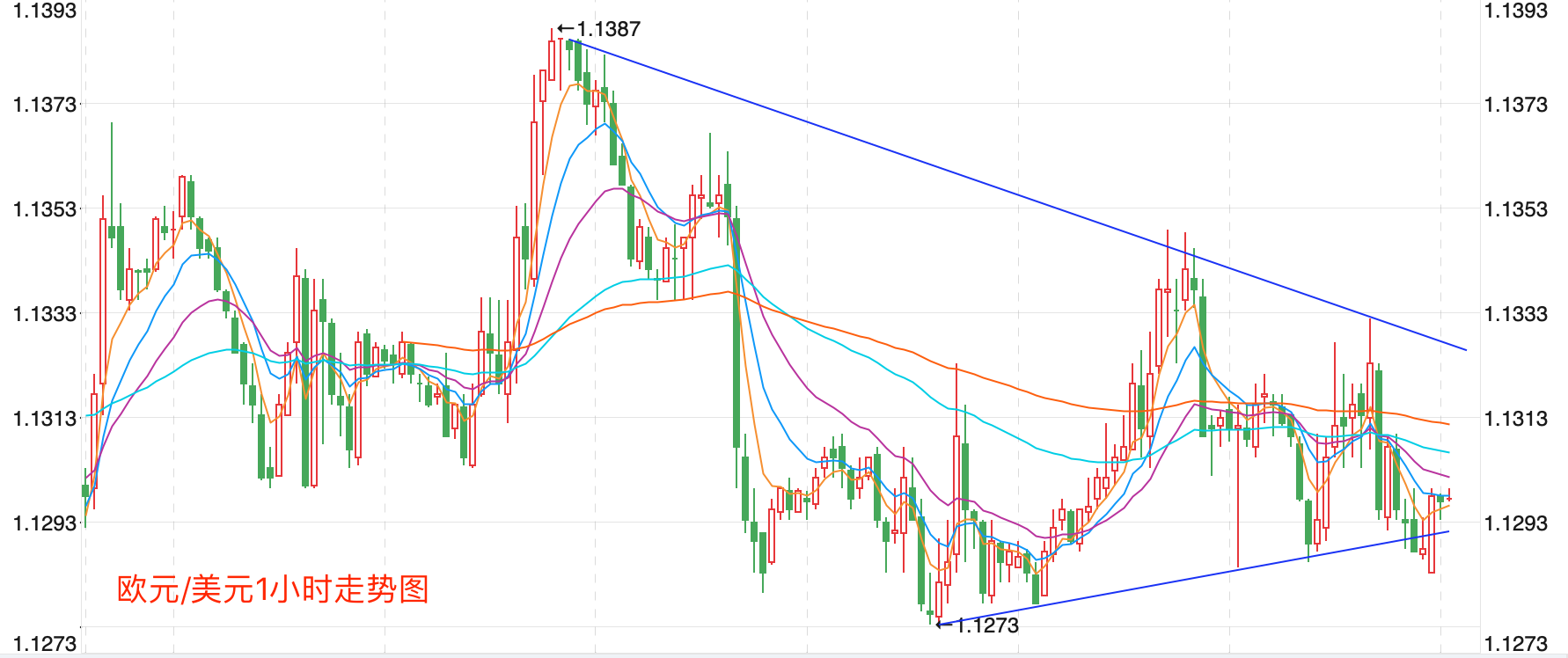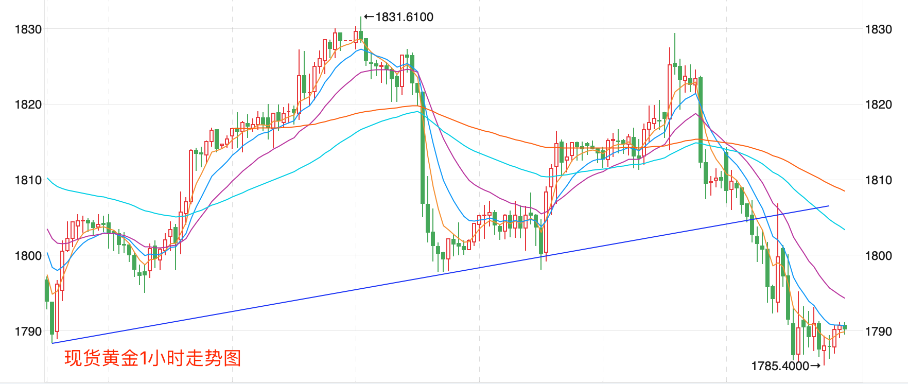 前期自2020年3月底企稳1.14078低点开启上涨走势,盘中突破了MA200均线的关键阻力而上行走高;2021年6月触及1.42493点高位后开始震荡走低,目前中期走势继续震荡向下走势。当前日内行情有向下调整的趋势。