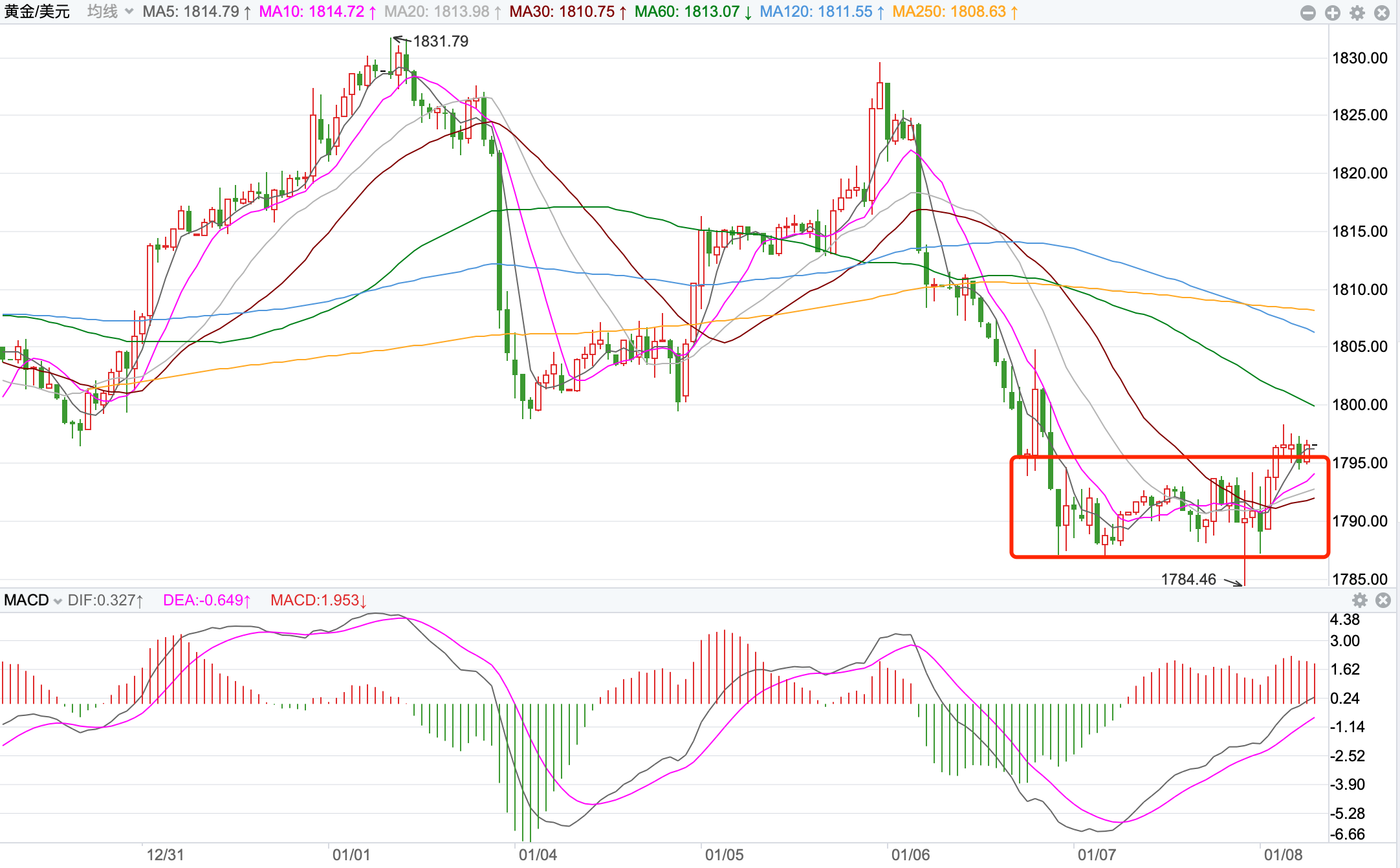 金价从1445美元/盎司的前期低点一路展开上行,创出之前2075的新高后,先回落后持续震荡下跌达到15个多月。当前整体价格在MA200上下运行,MACD指标弱势震荡,形成触底反弹的走势。近期短线1760美元是多头关键的支持,日内短线有反弹的趋势。