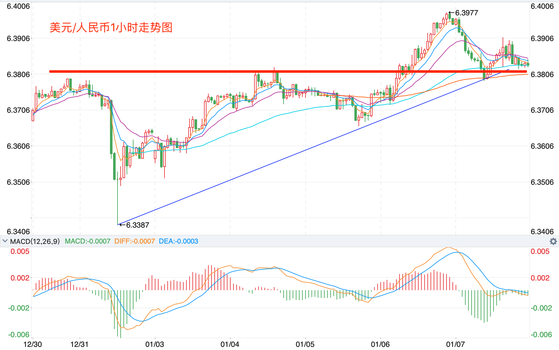 离岸价前期自2020年5月高位7.1964开启下跌走势,盘中跌破MA200均线的关键支持而下行走低;2021年5月触及6.3477点低位后开始震荡走高。当前行情日内有反弹向上的趋势。