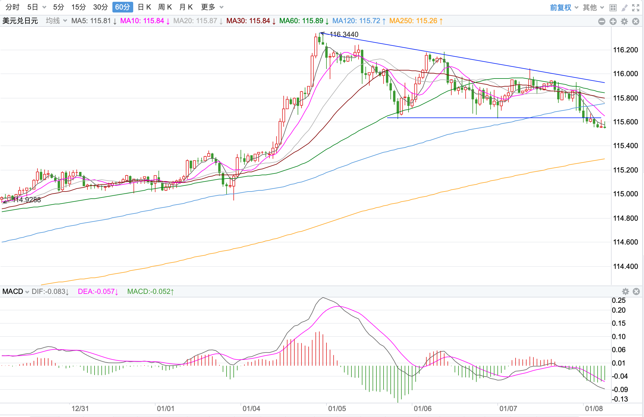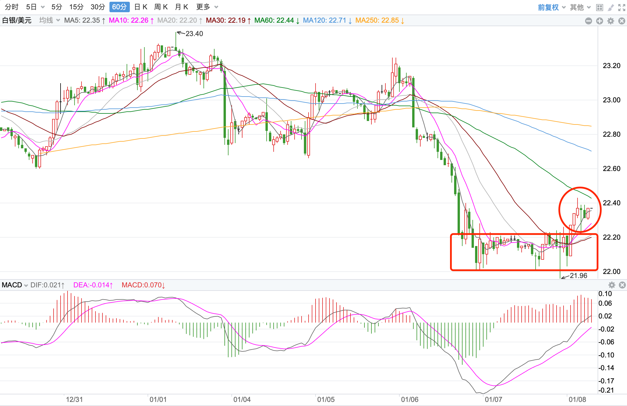 美元指数前期持续上涨在2020年3月份创出102.99点的高位后一路震荡回落走低,2021年1月份触及89.206点的低位后,开始向上持续震荡走高;2021年11月份指数突破MA60周线后保持其上运行,也已经打开了中长期上升的空间。当前指数站稳中期走势的支持上运行,当前日内短线行情下行的趋势。