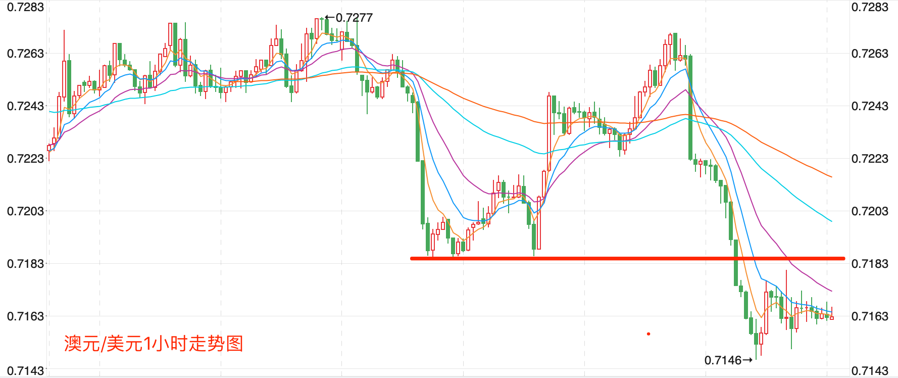 前期自2020年3月底企稳0.5673低点开启上涨走势;盘中突破了MA200均线的关键阻力而上行走高;2021年2月触及0.80072点高位后开始震荡走低,8月底企稳在0.7114点展开反弹走势再度终结,目前重回8月低点调整走势。当前日内行情有继续向下调整的趋势。