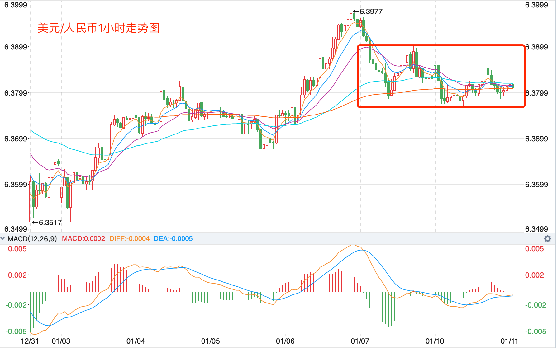 离岸价前期自2020年5月高位7.1964开启下跌走势,盘中跌破MA200均线的关键支持而下行走低;2021年5月触及6.3477点低位后开始震荡走高。当前行情日内持续横盘调整的趋势。