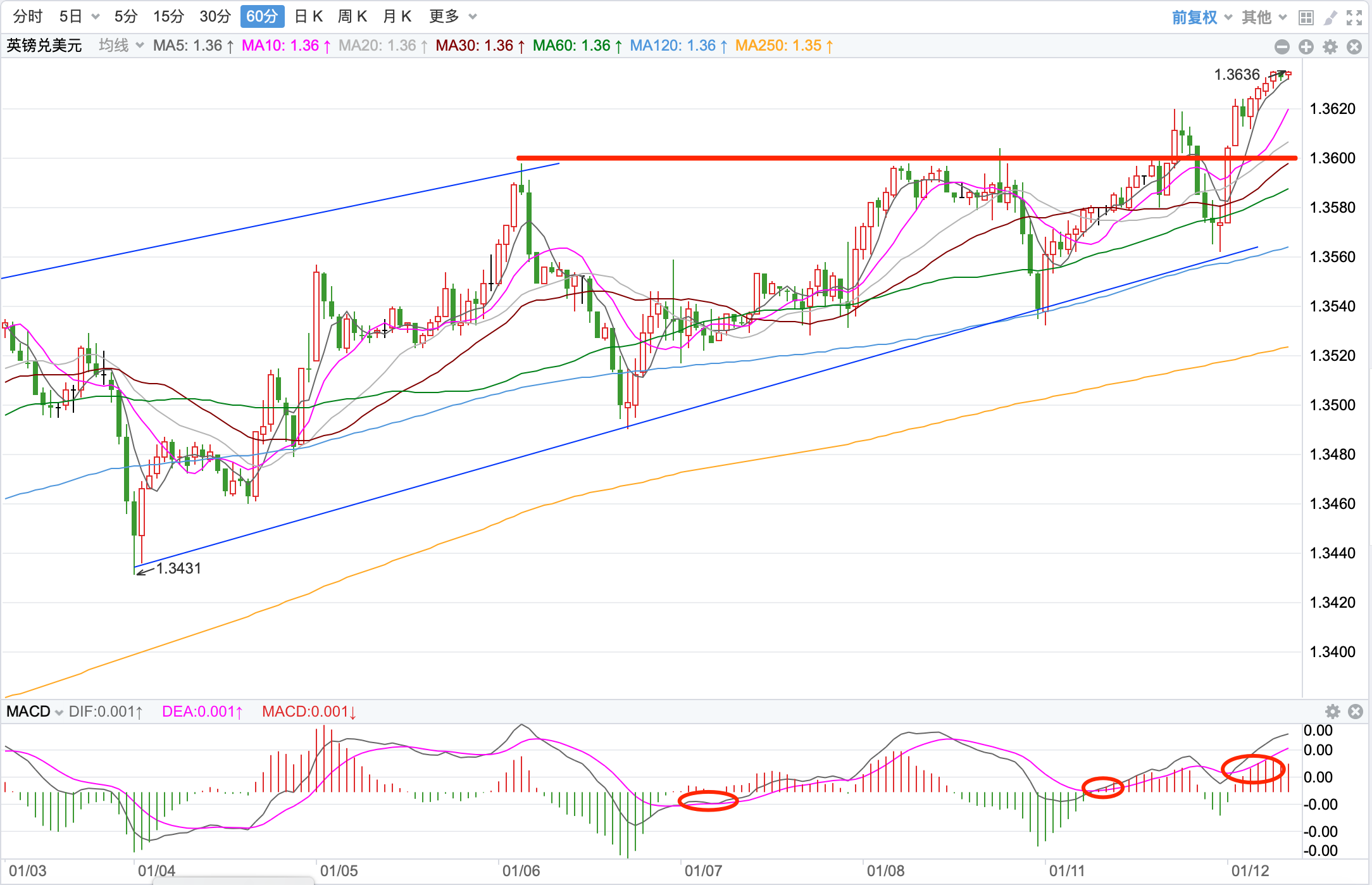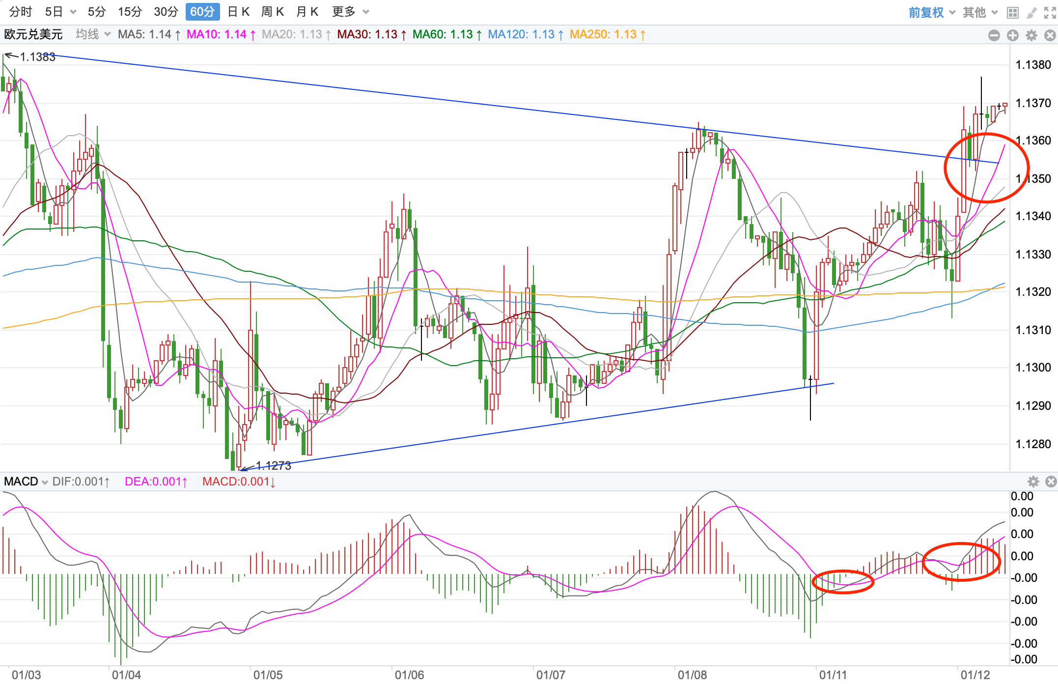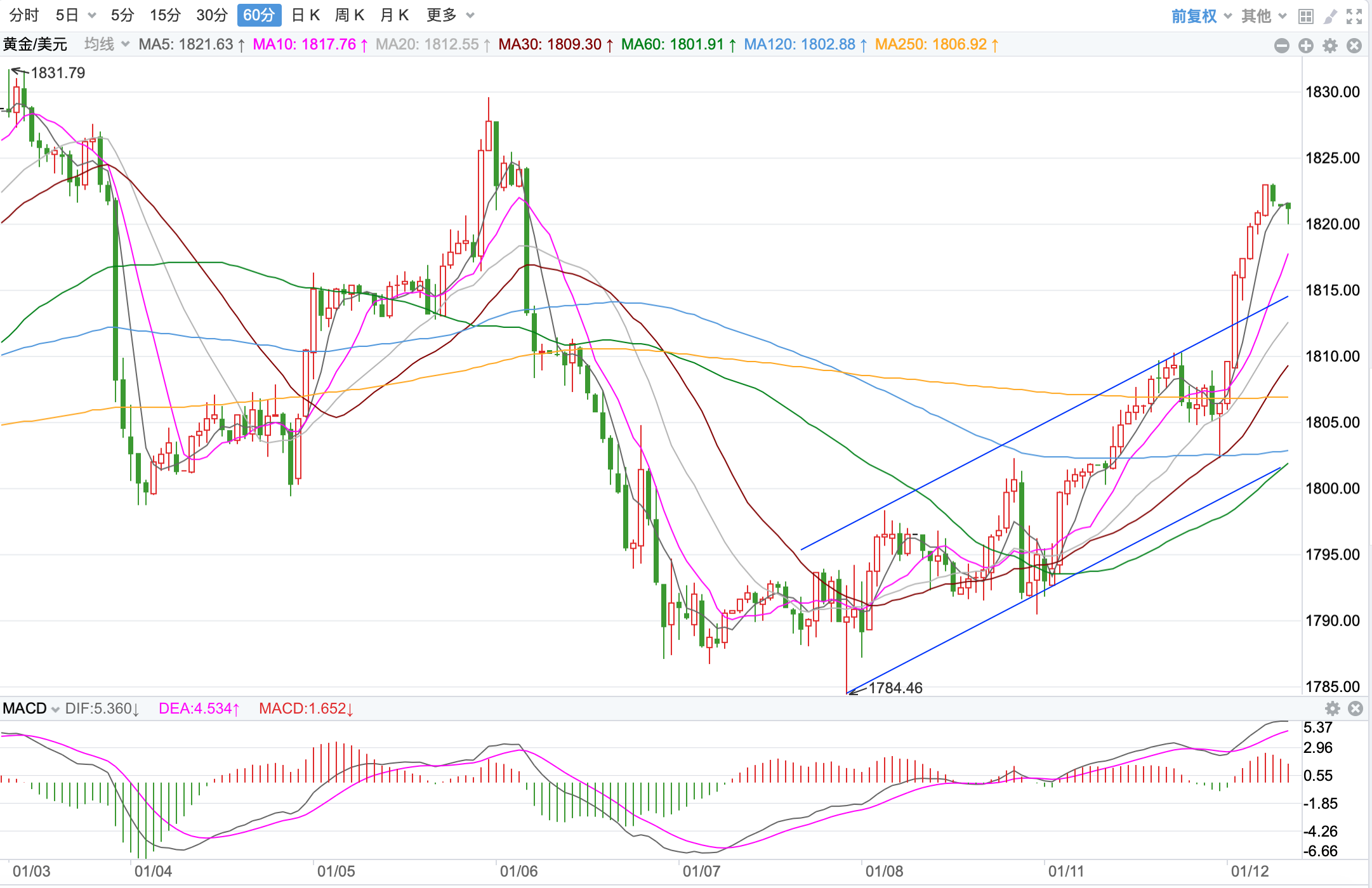 美元指数前期持续上涨在2020年3月份创出102.99点的高位后一路震荡回落走低,2021年1月份触及89.206点的低位后,开始向上持续震荡走高;2021年11月份指数突破MA60周线后保持其上运行,也已经打开了中长期上升的空间。当前指数站稳中期走势的支持上运行,当前日内短线行情下行调整的趋势。