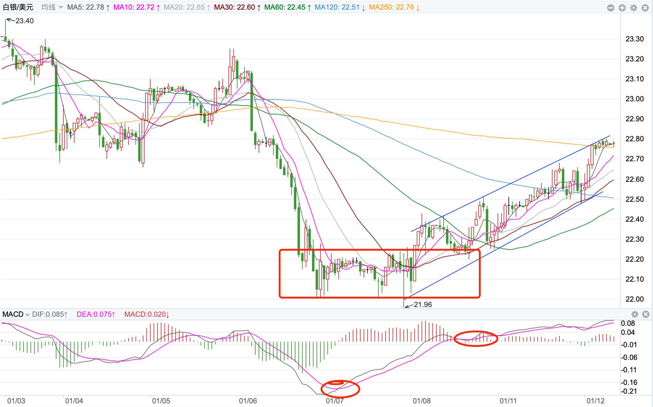金价从1445美元/盎司的前期低点一路展开上行,创出之前2075的新高后,先回落后持续震荡下跌达到15个多月。当前整体价格在MA200上下运行,MACD指标弱势震荡,形成触底反弹的走势。近期短线1760美元是多头关键的支持,日内短线有反弹的趋势。