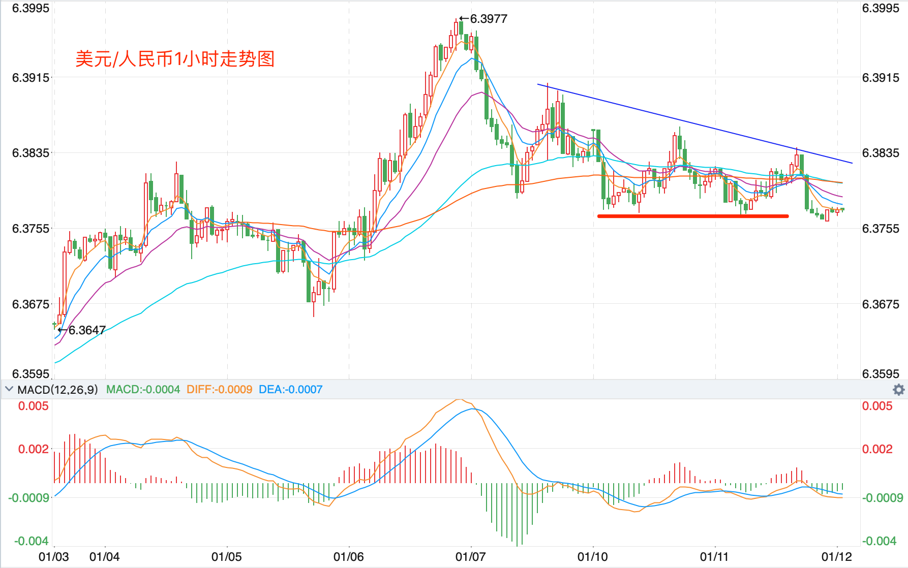 离岸价前期自2020年5月高位7.1964开启下跌走势,盘中跌破MA200均线的关键支持而下行走低;2021年5月触及6.3477点低位后开始震荡走高。当前行情日内持续横盘调整的趋势。