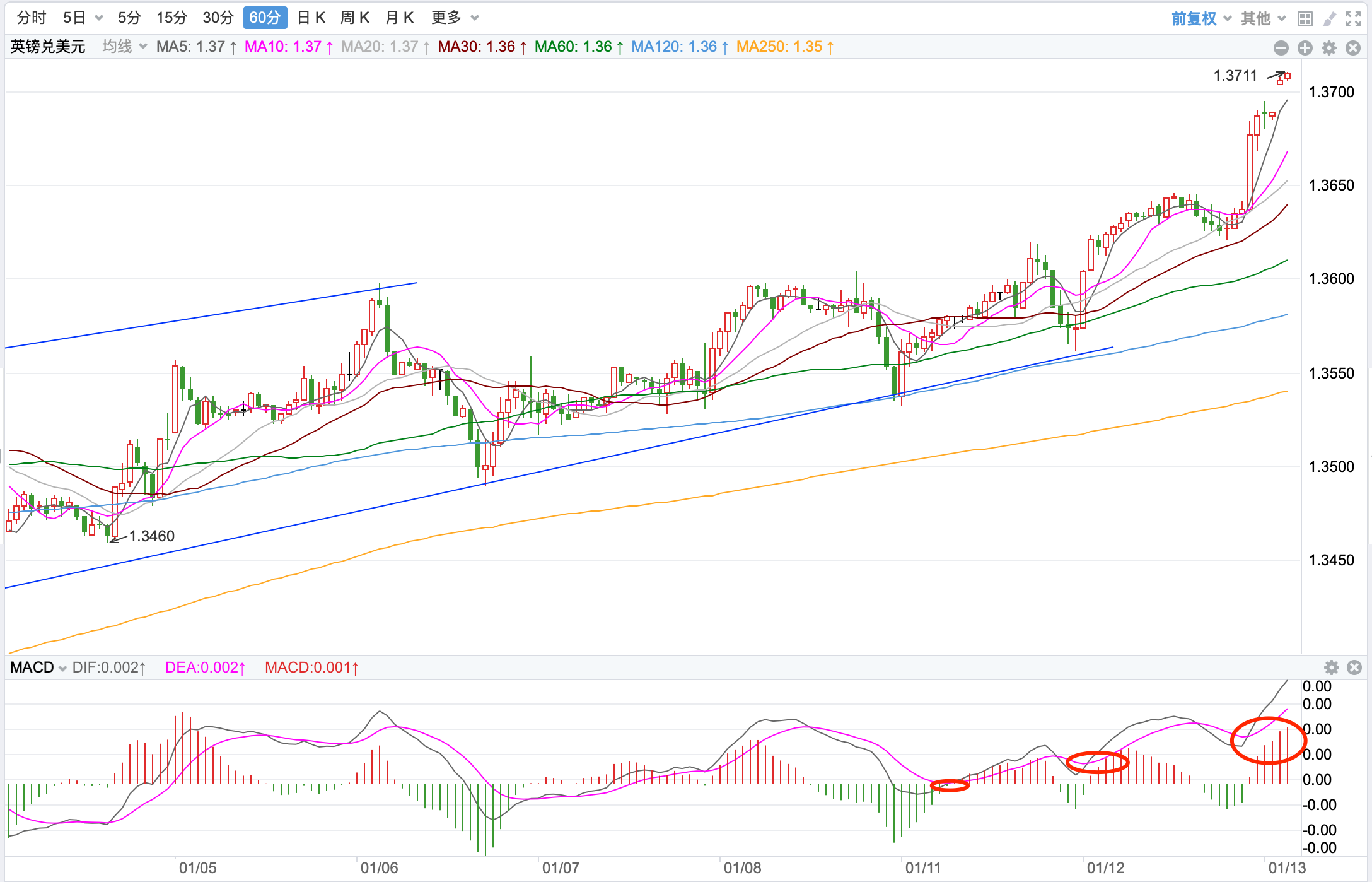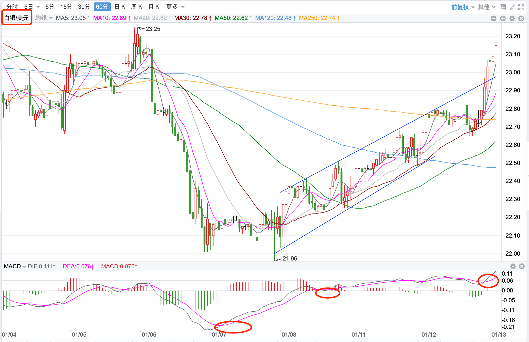 美元指数前期持续上涨在2020年3月份创出102.99点的高位后一路震荡回落走低,2021年1月份触及89.206点的低位后,开始向上持续震荡走高;2021年11月份指数突破MA60周线后保持其上运行,也已经打开了中长期上升的空间。当前指数站稳中期走势的支持上运行,当前日内短线行情下行的趋势。