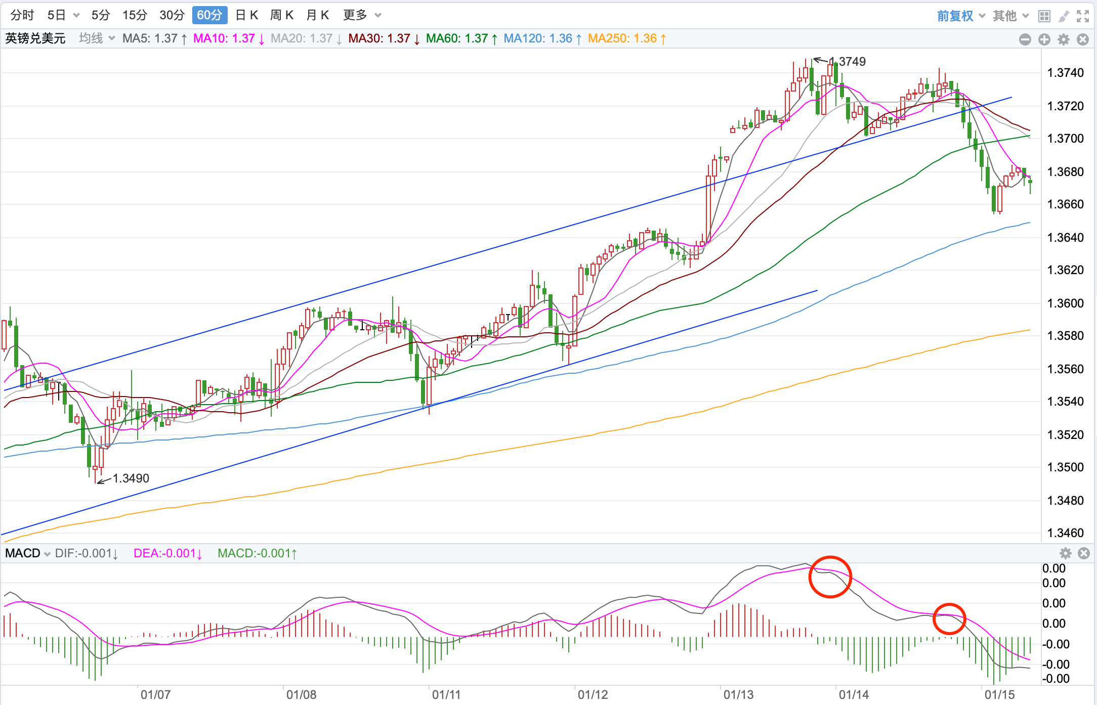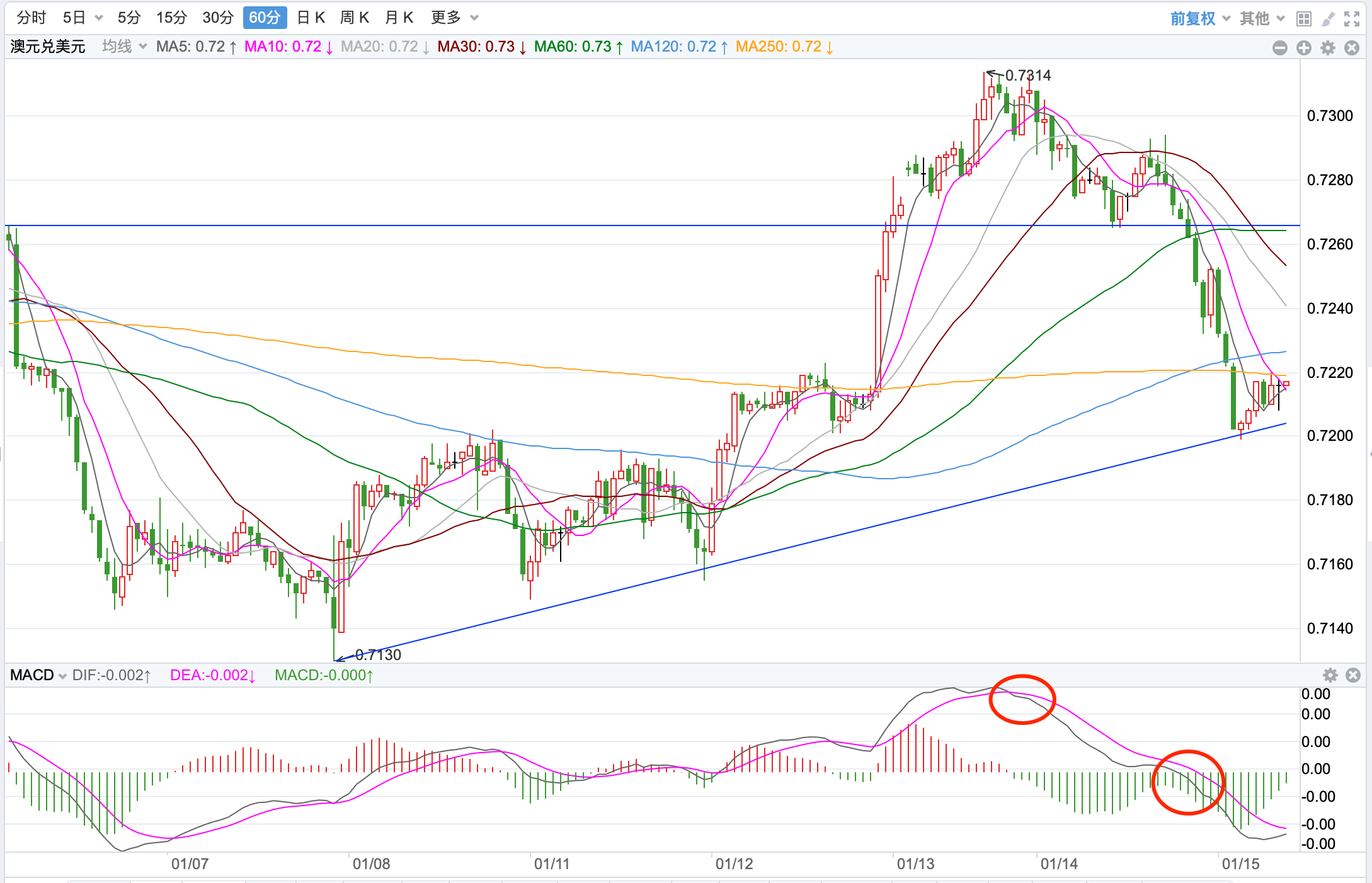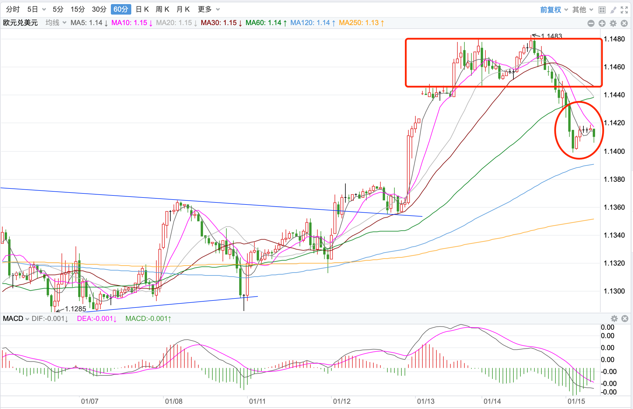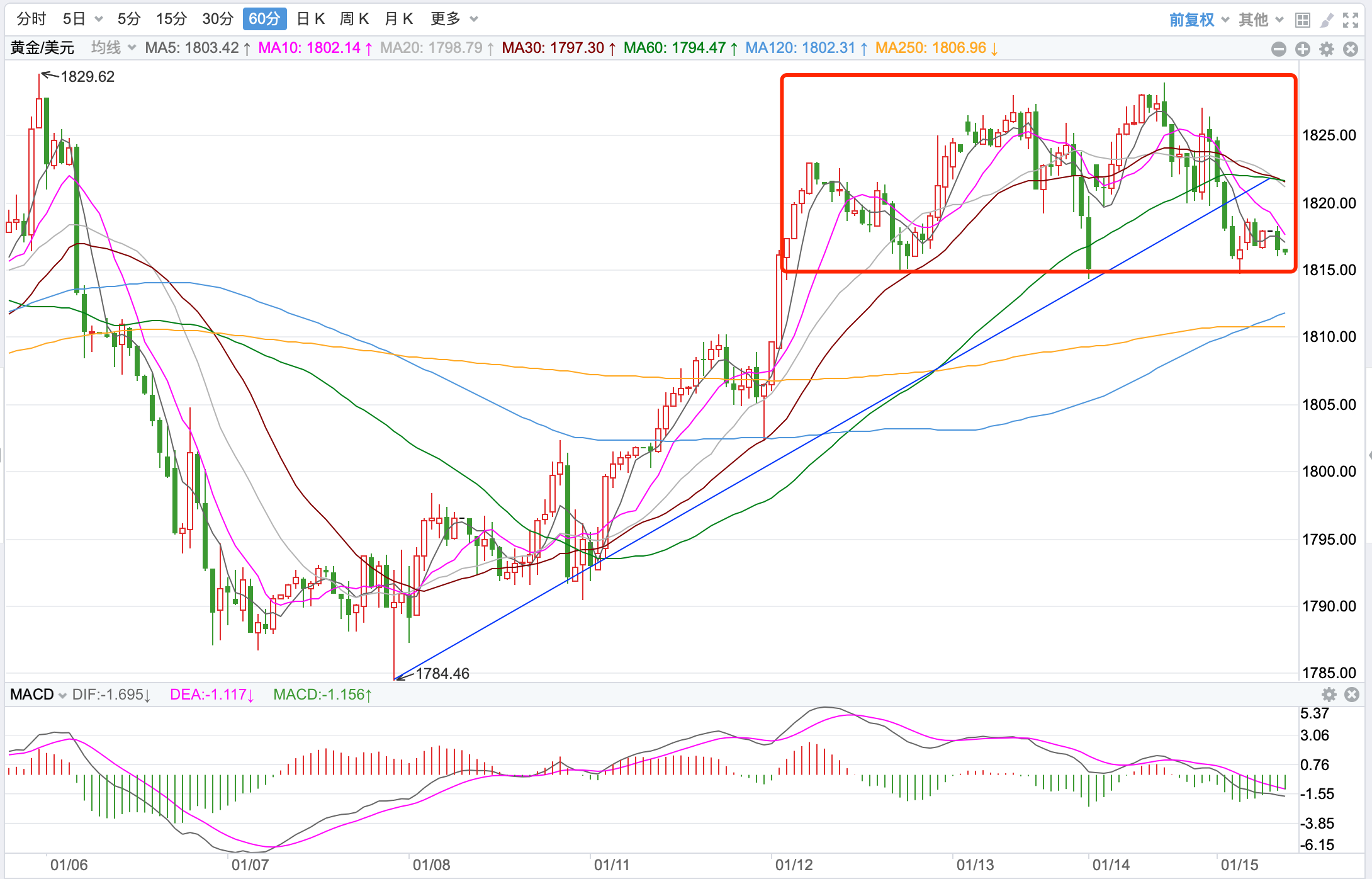 前期自2020年3月底企稳1.0635低点开启上涨走势;2021年1月触及1.23495点的高位后持续震荡下行。2021年11月跌破60周MA均线支持,中长期多空分水岭的支持跌破,行情处在回落调整的下行走势中。当前日内短线行情有向下的趋势。