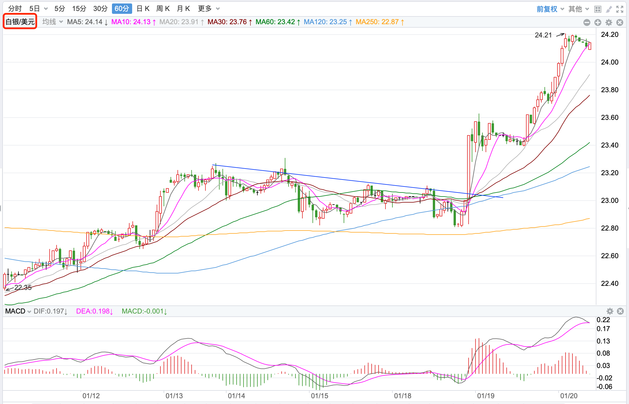 银价从19.64/盎司附近大幅下跌回落,创出五年来的新低到11.29美元附近,随后价格一路反弹上行,两次上涨达到30美元后展开回落。目前整体价格在MA200下方运行,MACD指标企稳弱势震荡,60均线跌破打开下跌空间。日内短线继续上涨趋势。