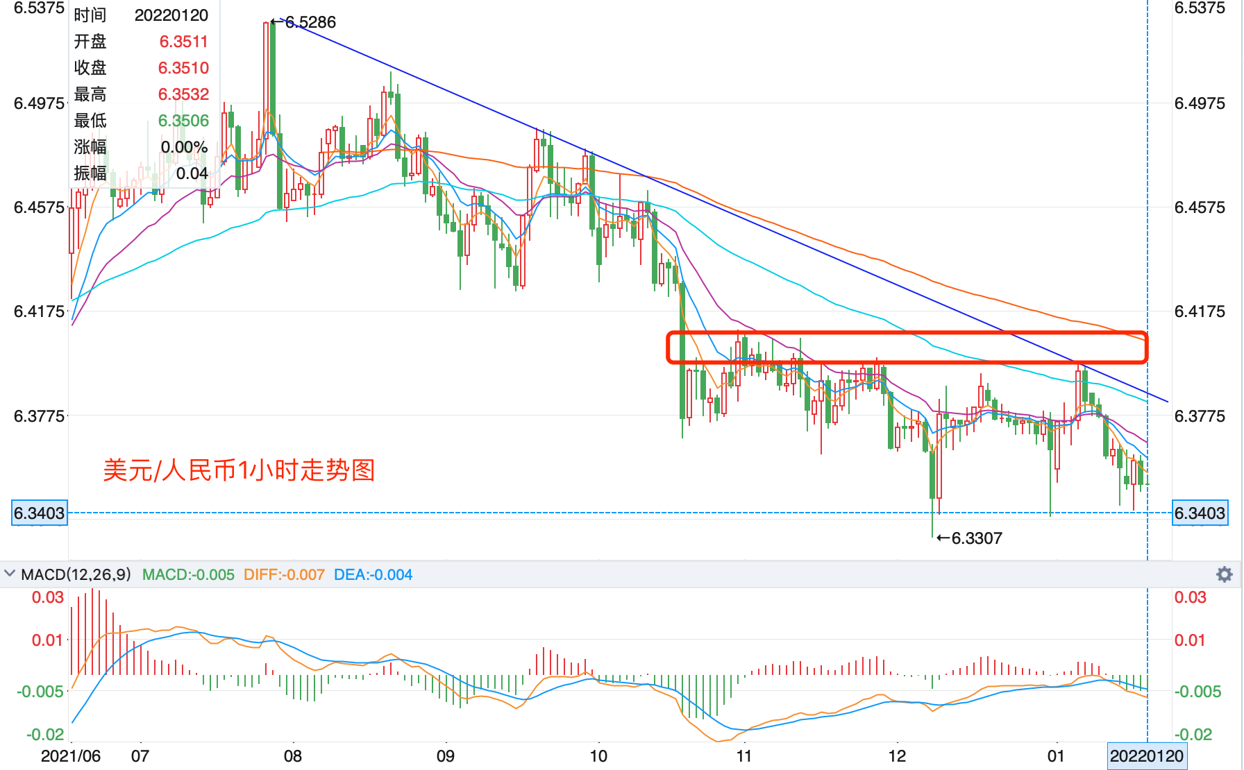 离岸价前期自2020年5月高位7.1964开启下跌走势,盘中跌破MA200均线的关键支持而下行走低;2021年5月触及6.3477点低位后开始震荡走高。2022年1月份保持在6.3-6.4之间震荡调整。当前行情日内有继续反弹调整的趋势。