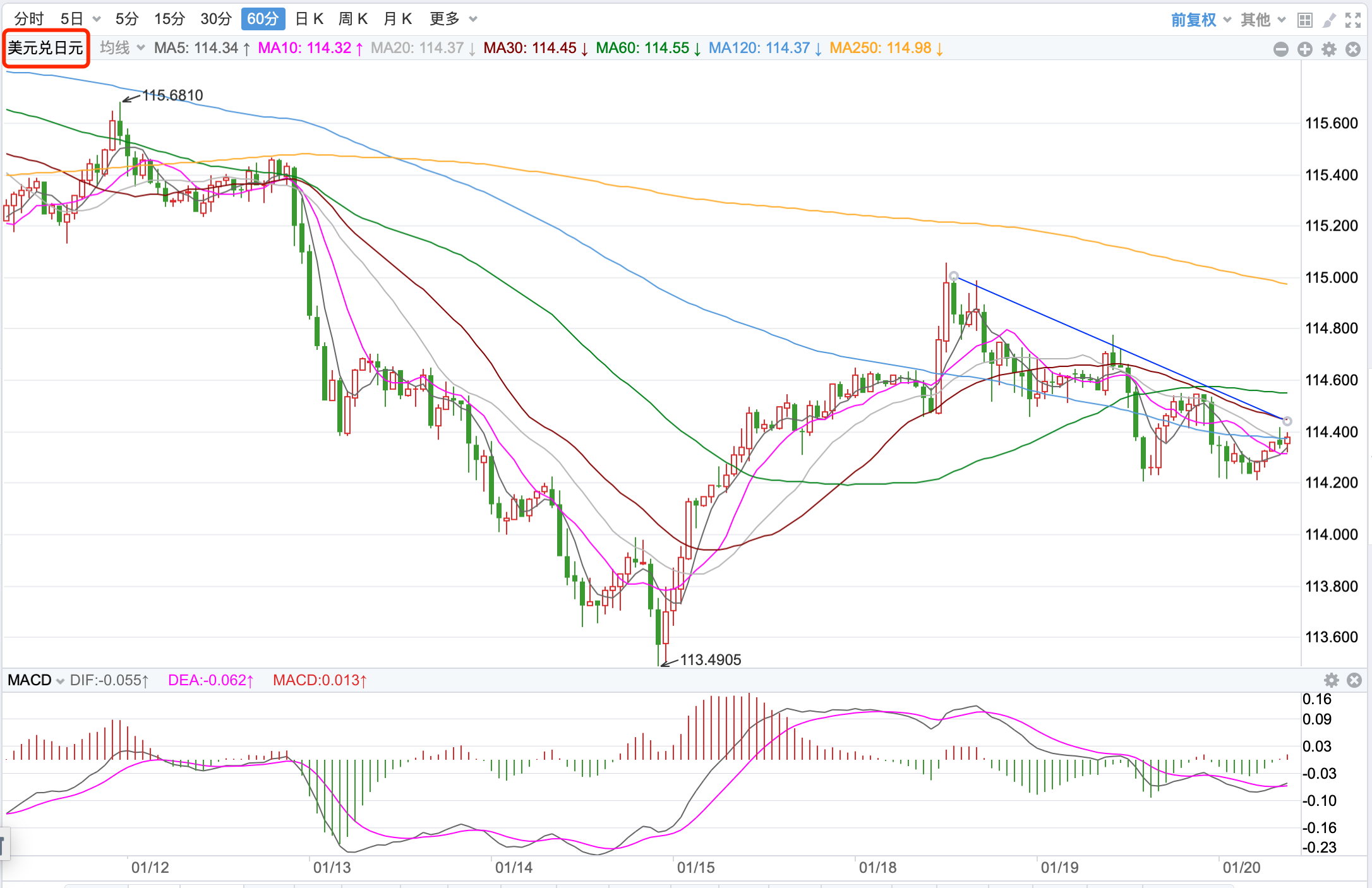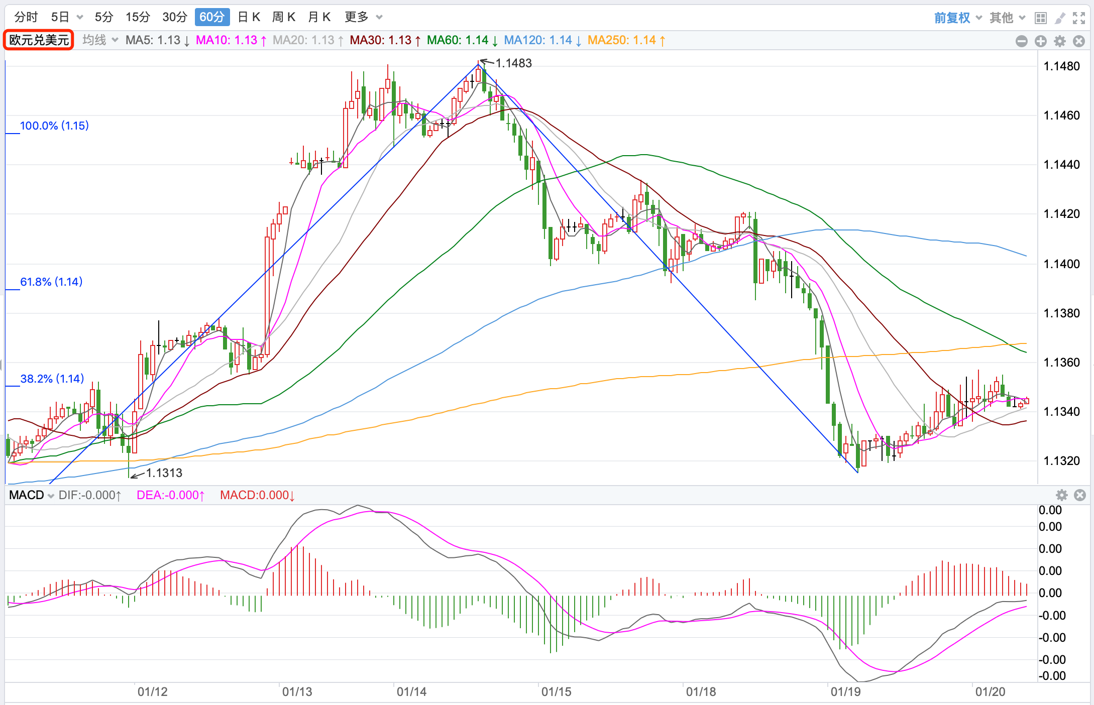 前期自2020年3月底企稳1.0635低点开启上涨走势;2021年1月触及1.23495点的高位后持续震荡下行。2021年11月跌破60周MA均线支持,中长期多空分水岭的支持跌破,行情处在回落调整的下行走势中。当前日内短线行情有继续向下的趋势。