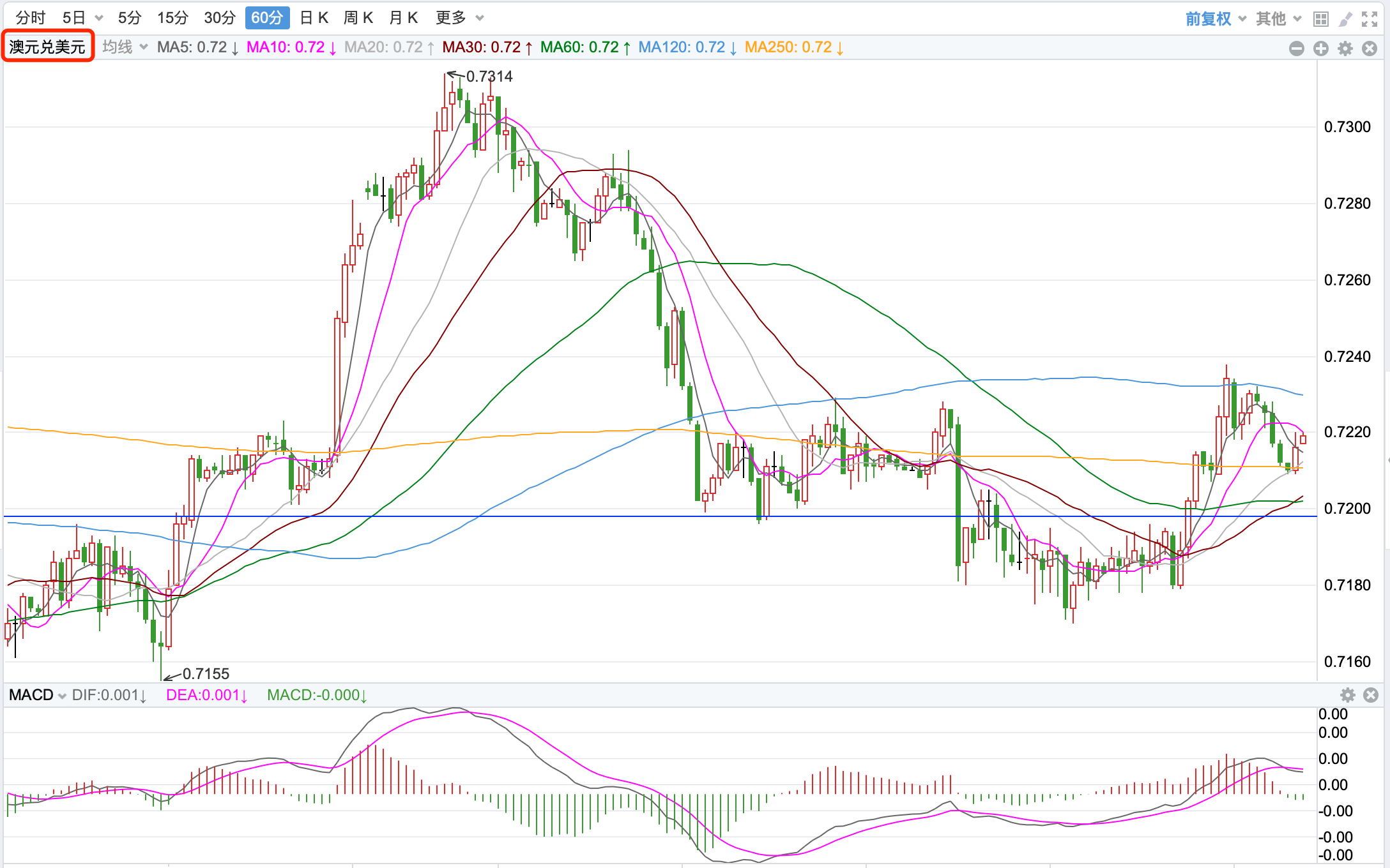 前期自2020年3月底企稳0.5673低点开启上涨走势;盘中突破了MA200均线的关键阻力而上行走高;2021年2月触及0.80072点高位后开始震荡走低,8月底企稳在0.7114点展开反弹走势再度终结,目前重回8月低点调整走势。当前日内行情有继续震荡下跌趋势。