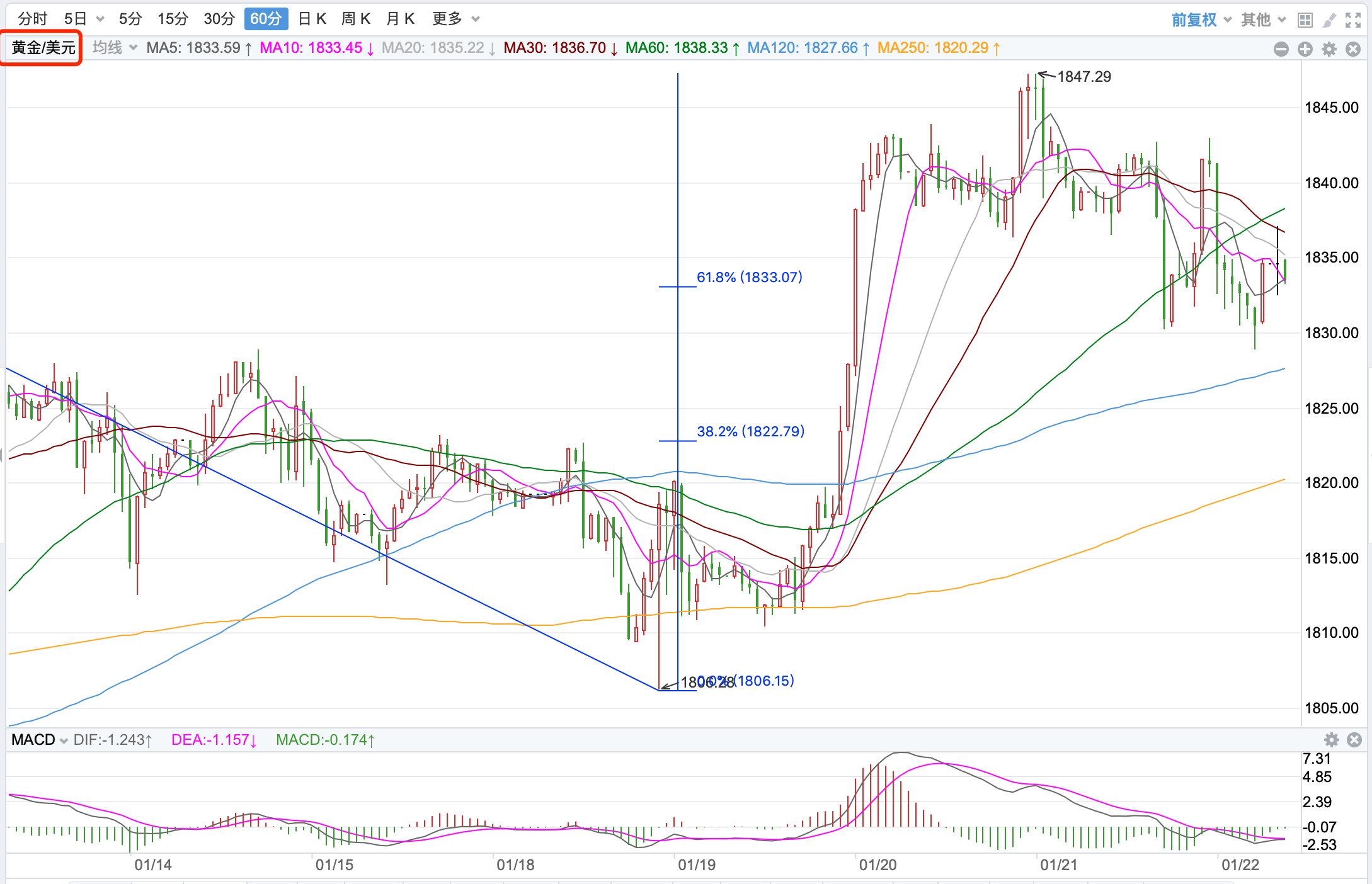 美元指数前期持续上涨在2020年3月份创出102.99点的高位后一路震荡回落走低,2021年1月份触及89.206点的低位后,开始向上持续震荡走高;2021年11月份指数突破MA60周线后保持其上运行,也已经打开了中长期上升的空间。当前指数站稳中期走势的支持上运行,当前日内短线行情有继续反弹向上的趋势。